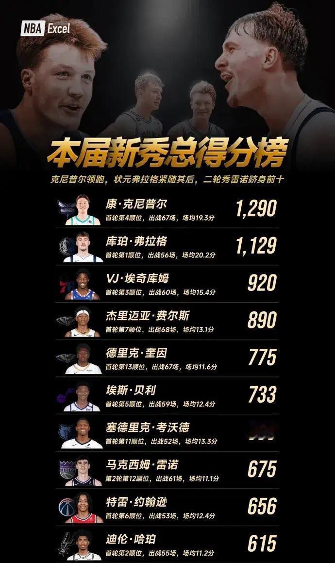 看新秀总得分榜,就知道新双骄出来了! 独行侠第一顺位的弗拉格,天之骄子。 黄蜂第四顺位的科尼普尔也不差,他是弗拉格的大学校友,目前新秀三分破库里记录。 这两个人应该能对决很多年。[大金牙]