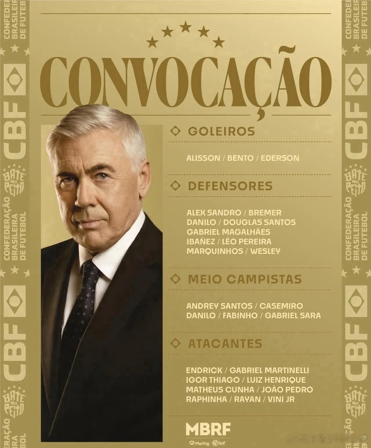 巴西公布大名单:巴西主帅安切洛蒂公布新一期友谊赛名单,内马尔、安东尼、里沙利松落选,维尼修斯、拉菲尼亚、卡塞米罗、恩德里克入选,罗德里戈、米利唐、吉马良斯和埃斯特旺伤缺。