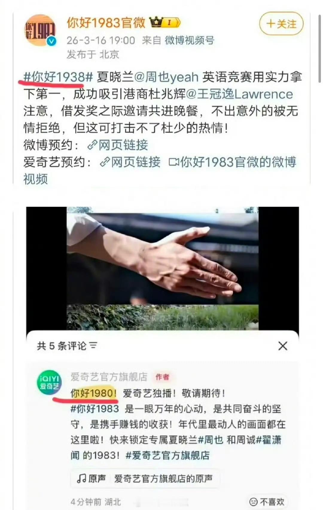 周也、翟潇闻新剧叫《你好1983》官博和平台连续把剧名写错,时代错乱了。请给一个