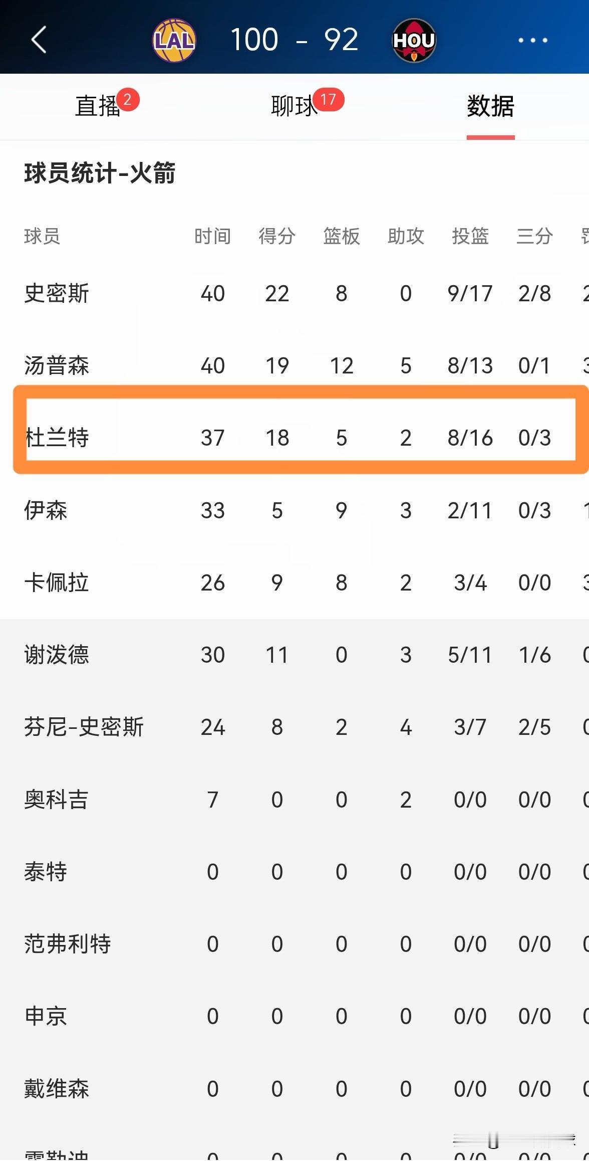 火箭超级球星杜兰特真是坑死了球队!在今天火箭主场以92:100输给湖人的比赛中,杜兰特不仅在下半场比赛中打出了极其拉胯的表现,而且出现了多达7次的失误,杜兰特绝对是火箭输球的罪魁祸首。 整场比赛下来,杜兰特首发出战37分钟,投篮16中8,其中三分球3中0、罚球2中2得到18分,还有7次失误,他的场上正负值为-7。 值得一提的是,在下半场比赛中,杜兰特仅仅得到可怜的2分,而且在比赛的关键时刻连续出现了不可饶恕的失误。