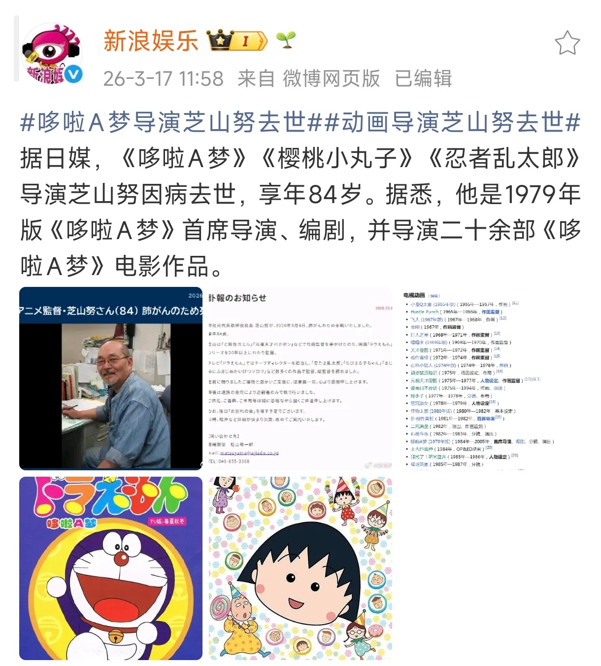 《哆啦A梦》《樱桃小丸子》导演芝山努去世了,时代的远去……