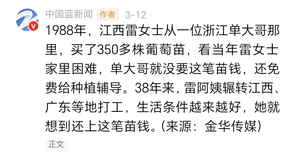 一个热心助人,一个知恩图报、铭记于心。38年前,江西的雷女士,从一位浙江的单大哥那里,买了350多株的葡萄苗。由于当时她家里,经济比较困难。这位单大哥就没有收取这笔葡萄苗的钱,并且还免费辅导雷女士种植葡萄。 这件事情之后,这38年来,雷女士一直辗转在江西、广东等地打工。如今生活条件大为改善,就想到了要还1988年,这笔葡萄苗的钱。 于是雷女士根据自己的记忆,来到了单大哥所居住的城市,浙江金华市。并在派出所,表达了来意,通过民警的协助下,联系上了这位单大哥。 时隔38年,两人在派出所再次相遇。彼此寒暄了一翻后,在民警的见证下,雷女士以现在市场价10倍的价格,付给了单大哥这笔葡萄苗的钱。 这是一段温馨的画面,想必这位单大哥,也没有想到,时隔38年,这位雷女士还能想到,找他支付当初的葡萄苗钱。 来源:中国蓝新闻、金华传媒