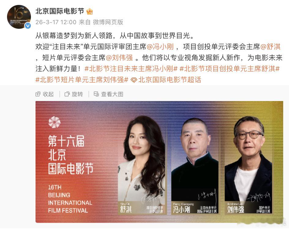 今日,第十六届北京国际电影节官宣“注目未来”单元国际评审团主席冯小刚,项目创投单元评委会主席舒淇,短片单元评委会主席刘伟强,活动将于4月16日正式开启!