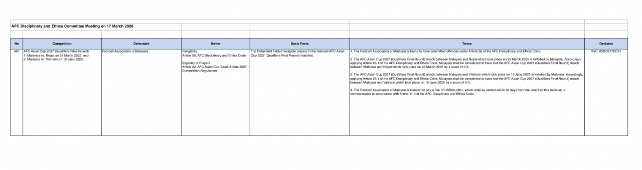 亚足联公布罚单,因马来西亚派出不符合资格的球员参赛,马来西亚2-0尼泊尔和马来西亚4-0越南两场亚洲杯预选赛第三阶段比赛被判0-3负。