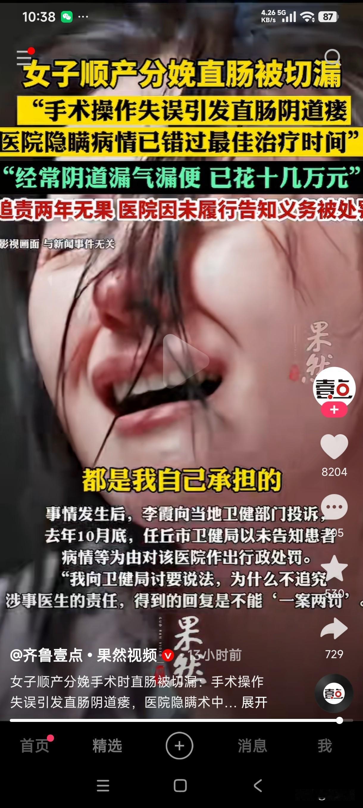 女子顺产分娩直肠被切漏,手术操作失误引发直肠阴道瘘,医院隐瞒病情错过最佳治疗时间,经常阴道漏气漏便,花费十几万不见好转,追责两年无果于是求助媒体。 谁能想到顺产生个孩子直肠被失误切漏,居然影响到了一辈子的生活,这手术操作失误的情况屡见不鲜,但第一时间发现手术失误,应该及时采取补救措施才是最正确的做法,然而这缺德医生居然隐瞒了病情,导致错过了最佳的治疗时间,这不是害人不浅吗? 对于一个正常生活的人来说,就因为顺产分娩直肠被失误切漏,如今阴道既是漏气又是漏大便,自己花费十几万病情仍然毫无好转,对今后的生活更是造成很大的影响,追责医院两年没有一点结果,投诉到卫健部门给出的说法是不能一案两罚,这是处罚了医院就不处罚医生了吗?如此缺德没有医德的医生还留着继续祸害其他人吗?