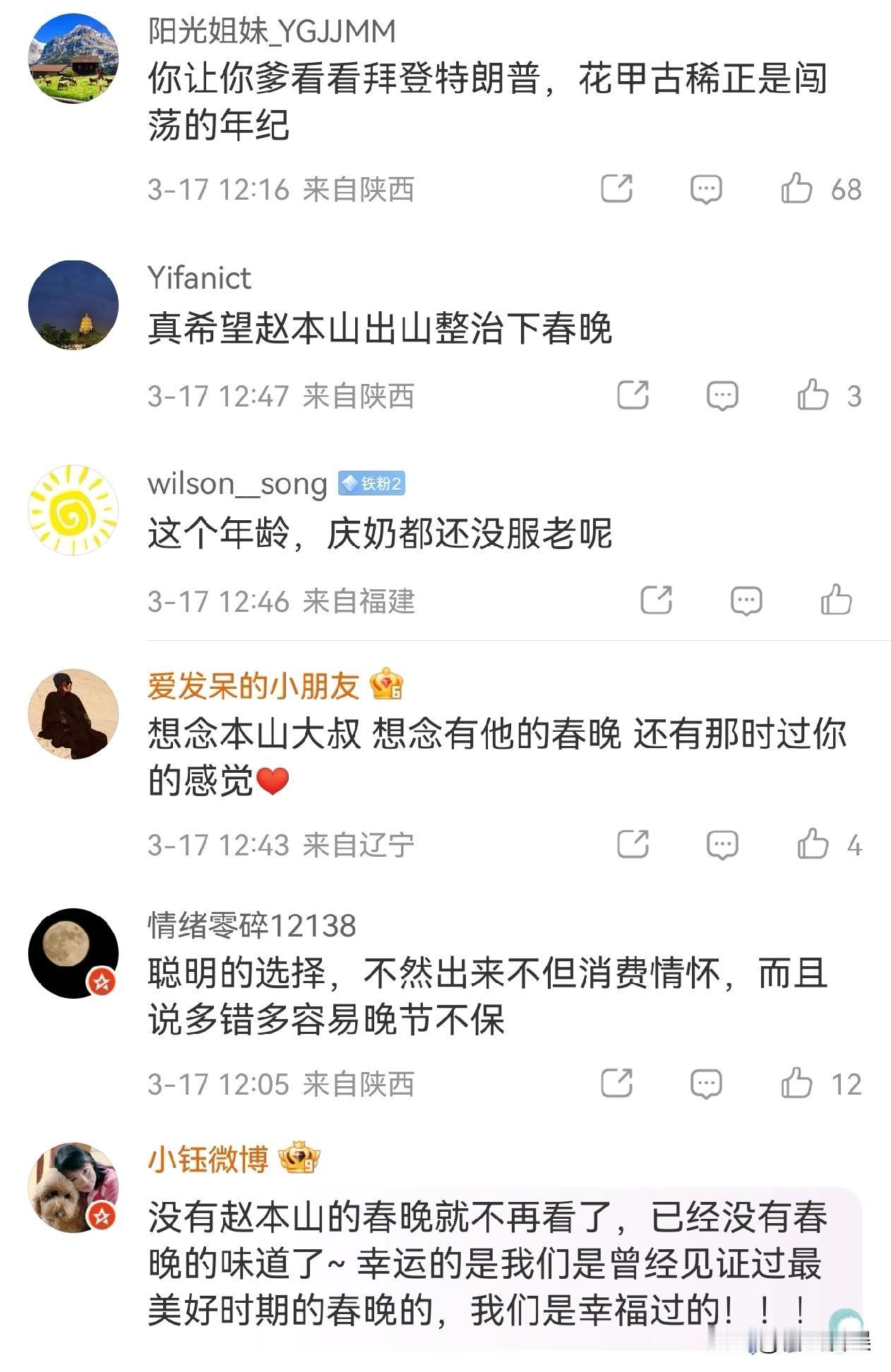 赵本山近况,冲上热搜! 3月17日,许久未公开露面的赵本山,因女儿球球的一句回应冲上热搜,瞬间勾起无数网友的回忆与感慨。 原来有网友在直播里追问球球:“现在请赵本山出山要多少钱?” 球球坦然回应:“他不出来了已经,我爸这个年纪现在就每天跑跑步,动一动。” 画面里的球球穿着灰蓝色格纹西装,戴着白色耳机对着麦克风直播,语气平和地透露父亲如今的生活状态——褪去舞台光环,回归日常的松弛与安逸。 这则消息一出,评论区瞬间被网友的怀旧与感慨淹没: 有人调侃“你让你爹看看拜登特朗普,花甲古稀正是闯荡的年纪”,也有人怀念“真希望赵本山出山整治下春晚”。 还有人感慨“没有赵本山的春晚就不再看了,已经没有春晚的味道了~幸运的是我们是曾经见证过最美好时期的春晚的”。 也有理性网友点赞:“聪明的选择,不然出来不但消费情怀,而且说多错多容易晚节不保”,更有无数人刷屏:“想念本山大叔,想念有他的春晚,还有那时过年的感觉”。 说起赵本山,那是刻在几代人记忆里的“春晚符号”。 从《卖拐》到《不差钱》,他用一口地道的东北话,把小人物的幽默与温情搬上舞台,承包了无数人的除夕笑声,是当之无愧的“小品王”。 舞台上他是制造欢乐的喜剧大师,卸下光环后,他选择回归生活,在跑步与日常里安享晚年。 这份从容退场的选择,既守住了观众心中的经典,也让大家看到了一代艺术家的通透与清醒,难怪网友们纷纷感叹:“本山大叔永远是我们心里的春晚白月光,现在这样安享晚年就很好!” 对此,你们怎么看?