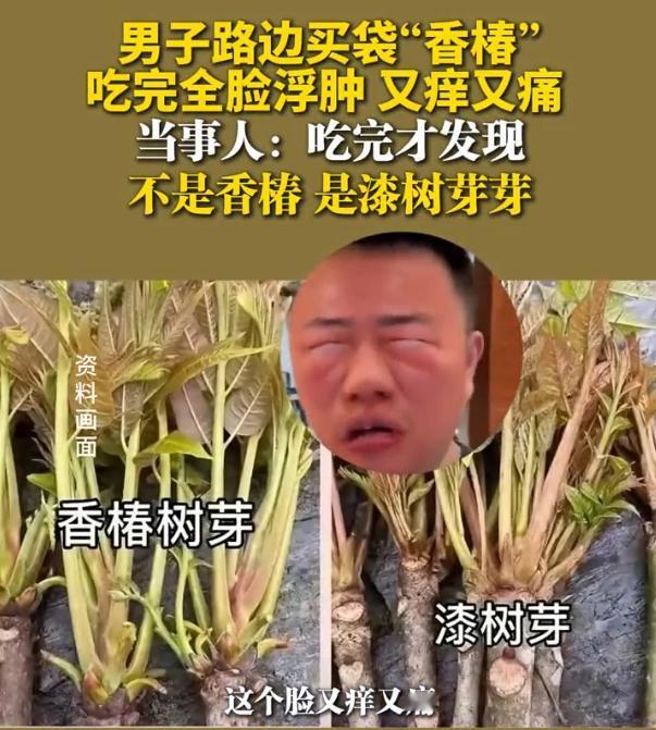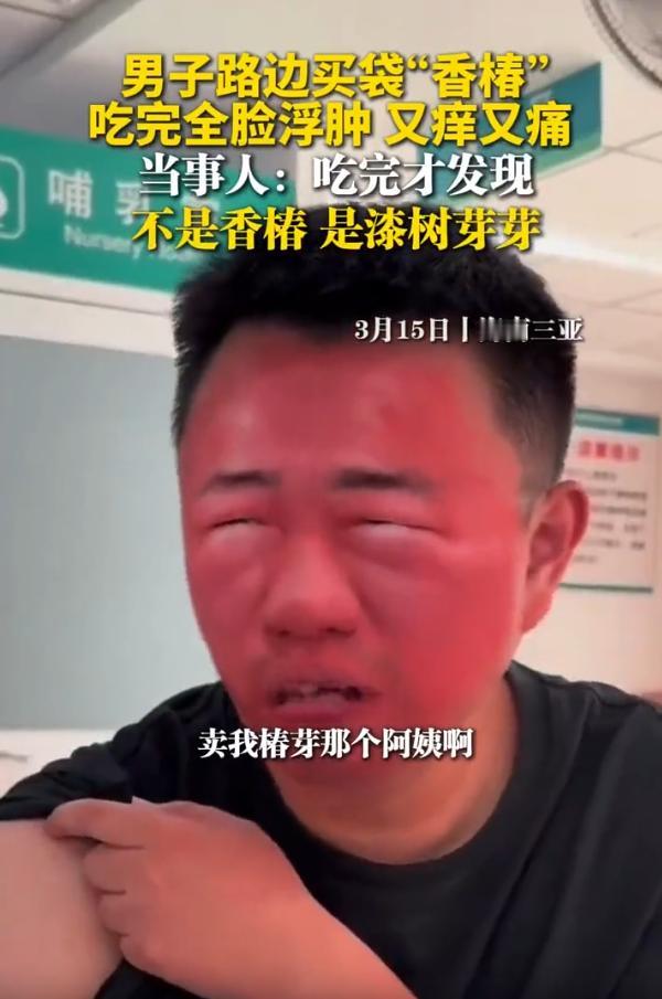 太惨了!海南三亚,男子在路边看到有阿姨摆摊卖香椿,就直接买了一袋回家吃,不料,吃完后却浑身又痛又痒,脸都红成了“猴屁股”,他这才知道,吃的根本不是香椿,而是漆树芽芽 这阵子正是吃春的时节,香椿绝对是菜市场里的C位,毕竟这玩意儿金贵,按两卖的,价格有时候比肉还狠。大家买它,不就是图那一口鲜,想尝尝春天的味道嘛 当天,男子在路边瞧见个阿姨摆地摊,卖的东西看着眼熟,红褐色的嫩芽芽,捆成小把,这不是刚上市的香椿芽吗?他也没多想,看着价格合适,顺手就买了一袋,心里可能还美滋滋地盘算着回家是香椿炒鸡蛋还是凉拌 吃完没多久,他就感觉浑身不对劲,先是痒,后来是又疼又痒。照镜子一看,好家伙,整张脸肿得发亮,通红一片,用他自己的话来说,简直成了“猴屁股”。眼睛肿成一条缝,都快睁不开了,那模样别说多狼狈 跑到医院一检查,医生告诉他,你吃的那哪儿是香椿啊,那是漆树芽! 在农村待过的都知道它的厉害,外号叫“咬人树”。不是说它真咬人,是它的汁液里有漆酚,这东西是个超级过敏原 。很多人哪怕从漆树旁边路过,皮肤沾点边,都能肿成“猪头”,身上起大红疙瘩,痒得钻心 随后,男子在医院那叫一个委屈,发视频吐槽:卖我椿芽的阿姨啊,你把我整神了 其实这个事也算是一个提醒,路边的野菜你别瞎买。很多人觉得路边阿姨卖的,是自家采的,新鲜、土味、正宗 但你有没有想过,这些阿姨很可能自己也分不清!在她们眼里,春天山上发的芽,长得都差不多,红色的可能就是香椿。这种“无意的伤害”最可怕 在吃的上面栽跟头,多半是因为馋。但为了不因为馋而进医院,咱们还是得长个心眼。对于那种刚冒头的、红彤彤的嫩芽,拿不准的,宁可去超市买包装好的,也别随便信路边的“野货”