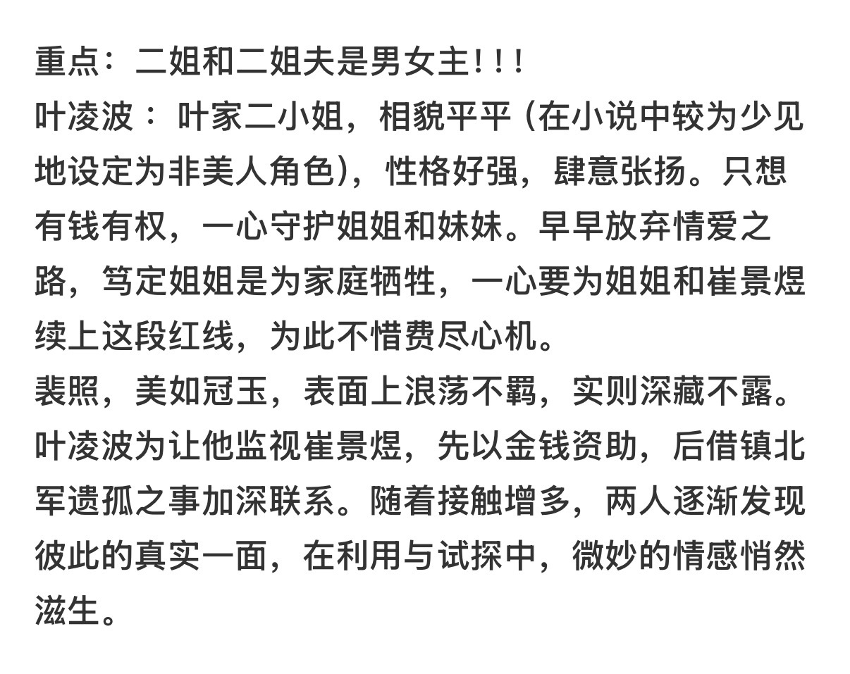 《当年不肯嫁东风》讲述叶家三姐妹于姻缘旋涡中共谱春日传奇的动人故事! 三姐妹3对cp ! 二姐和二姐夫是男女主!女主有钱有权家里的财富担当,生意做的很大!