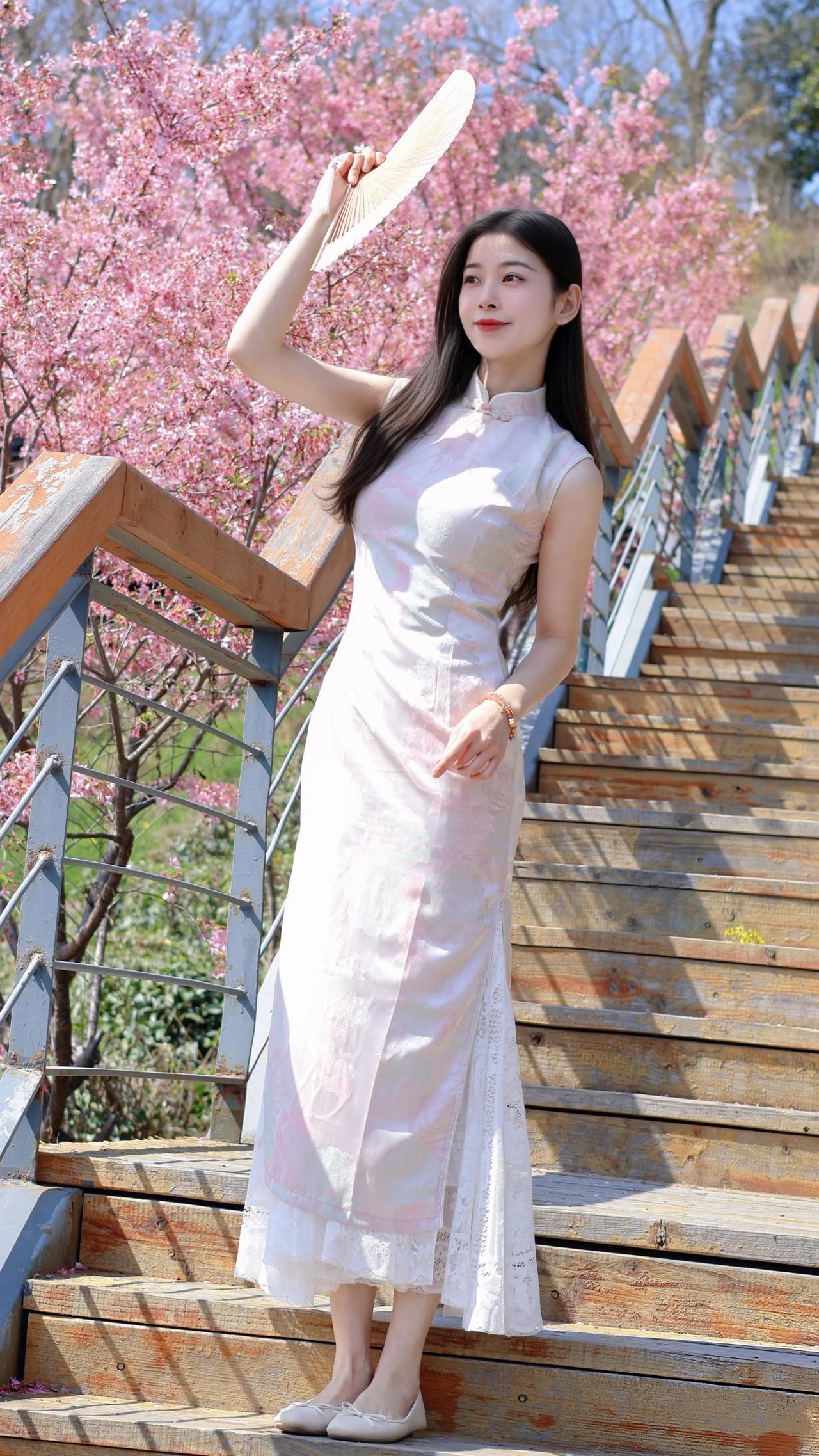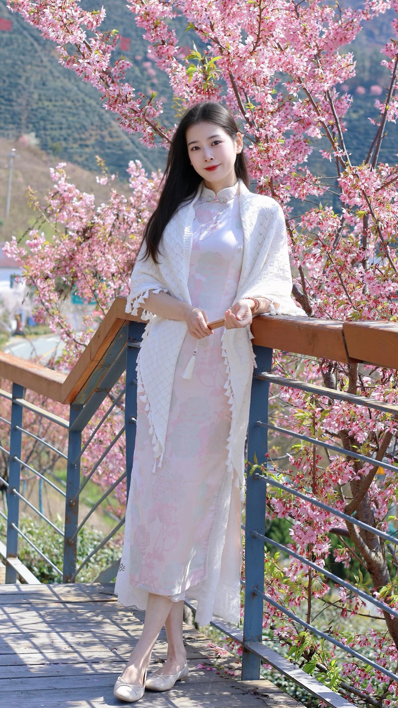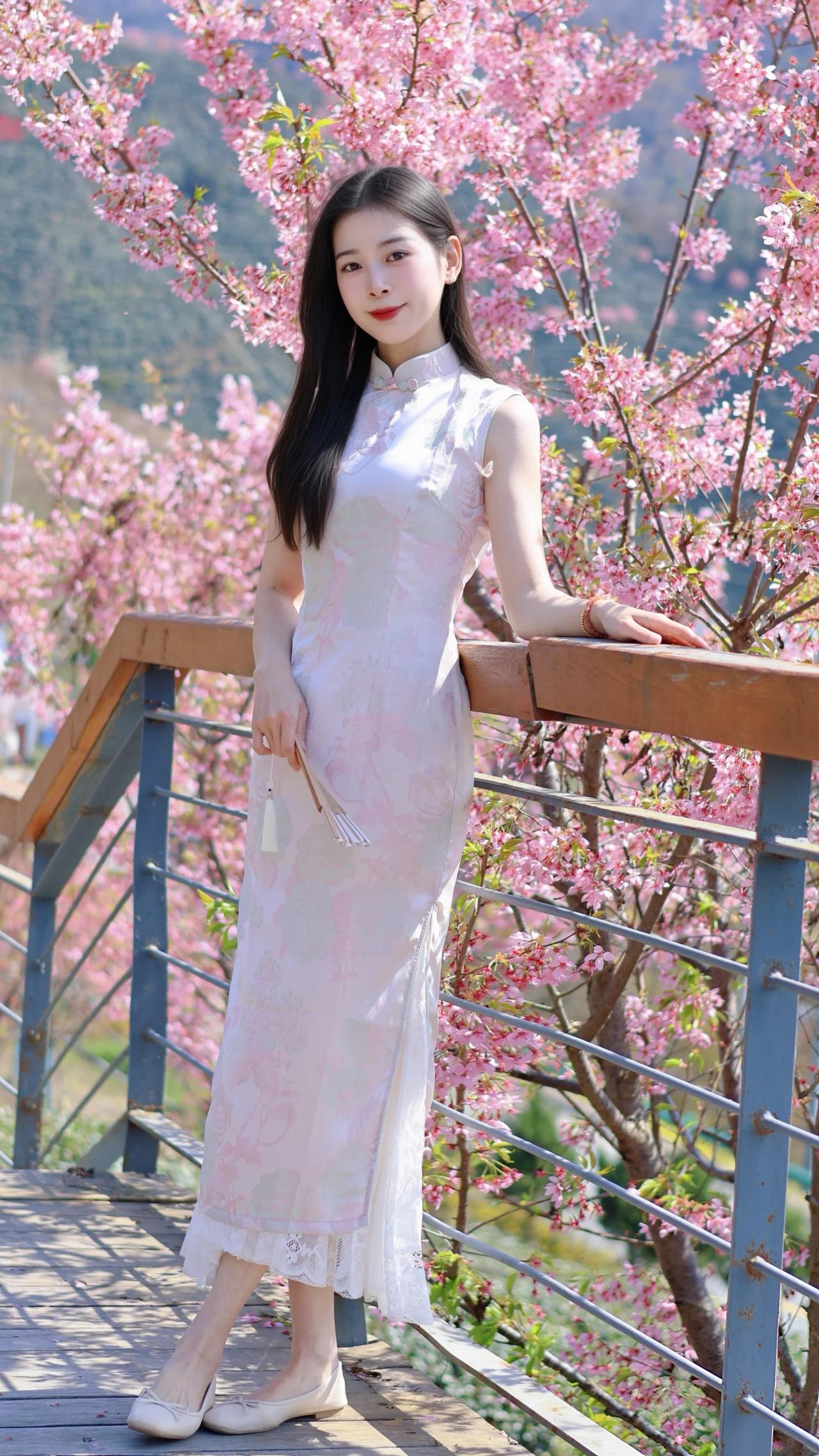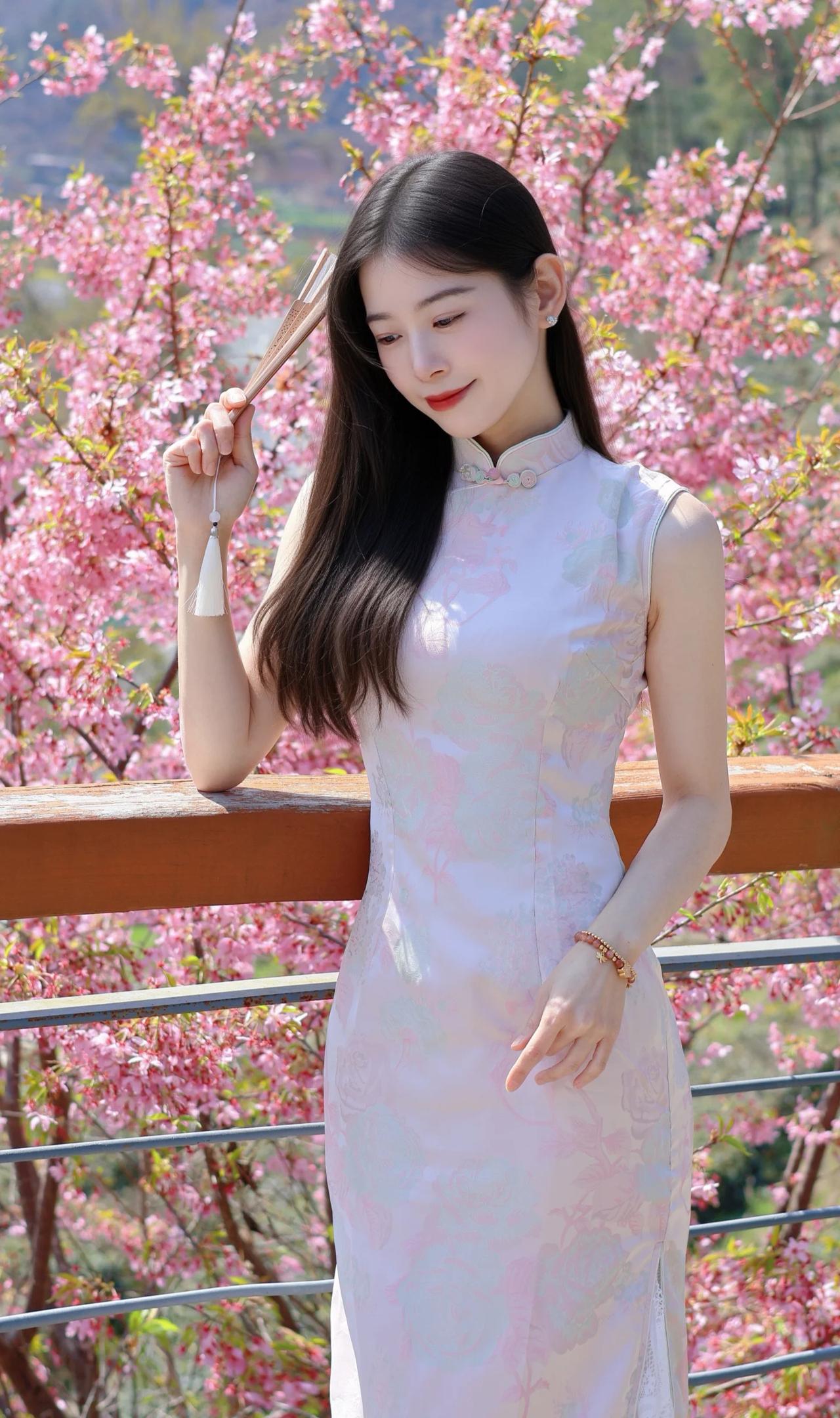 👘 穿搭与造型 少女身着淡粉底色无袖旗袍,裙身绣着浅绿与柔粉的花卉暗纹,领口缀着精致玉扣,下摆拼接蕾丝花边,温柔又灵动。 长发乌黑顺直,自然垂落肩头,几缕碎发修饰脸型,尽显温婉气质。 配饰上,手持一把带白色流苏的木扇,腕间叠戴细金链与红珠手串,耳间点缀小巧钻饰,素雅又精致。 部分造型外搭一件白色镂空针织开衫,流苏下摆增添了慵懒感,更添春日暖意。 🌸 场景与氛围 背景是盛放的樱花林,粉云般的花枝层层叠叠,在澄澈蓝天与远山的映衬下格外明媚。她或倚在木质栏杆上轻垂眼眸,或站在石阶上抬扇浅笑,阳光透过花枝洒下斑驳光影,将旗袍的柔润质感与樱花的粉嫩色调晕染得恰到好处,仿佛从旧时光里走出的江南女子,一颦一笑都藏着春日的温柔与东方的雅致。