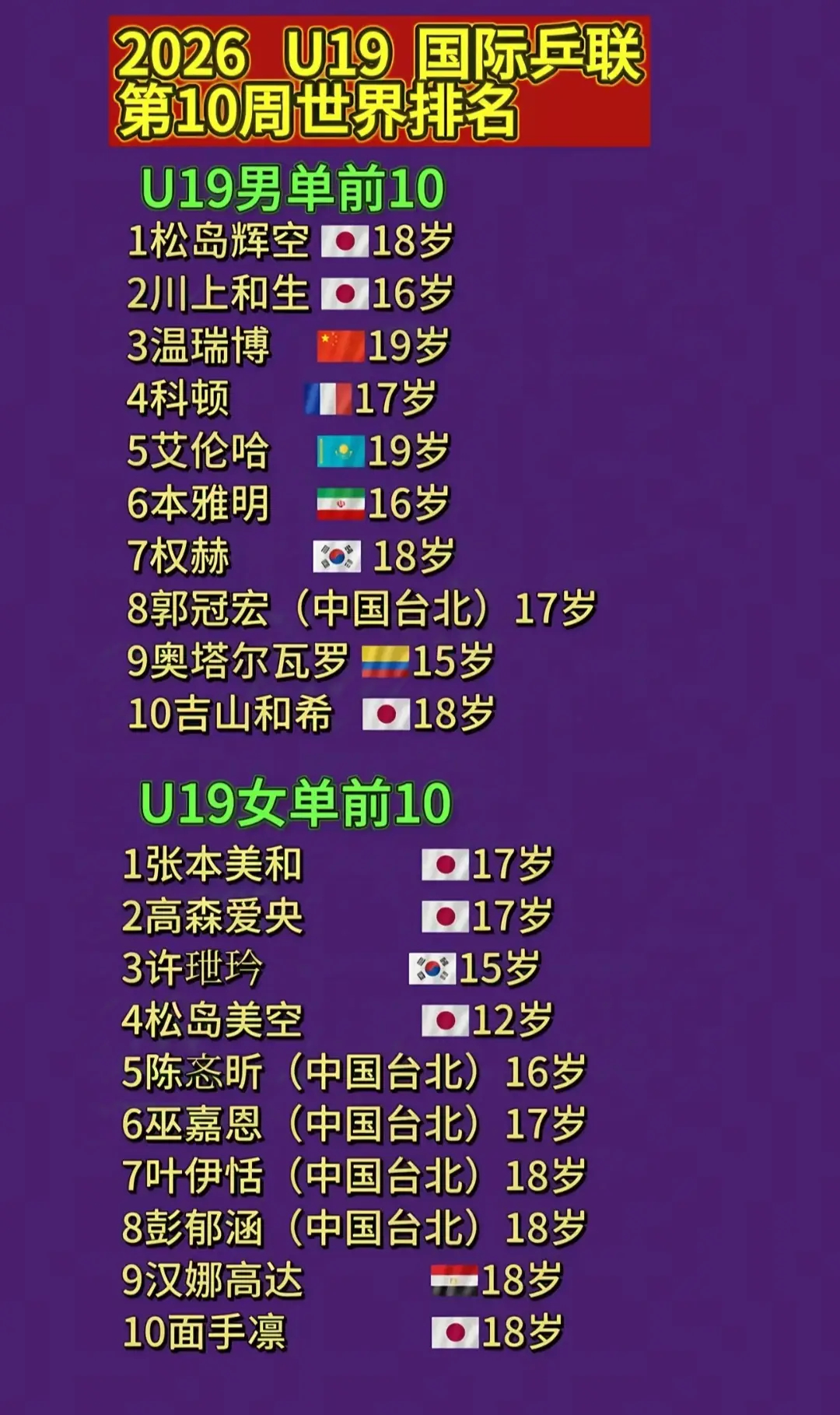 🔻U19世界排名,国乒男单前十就一个,女单前十挂零。(中国台北有5个)