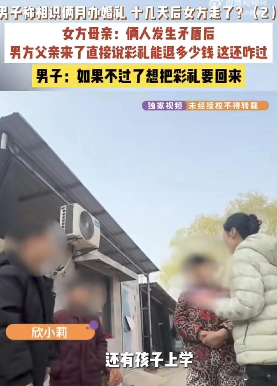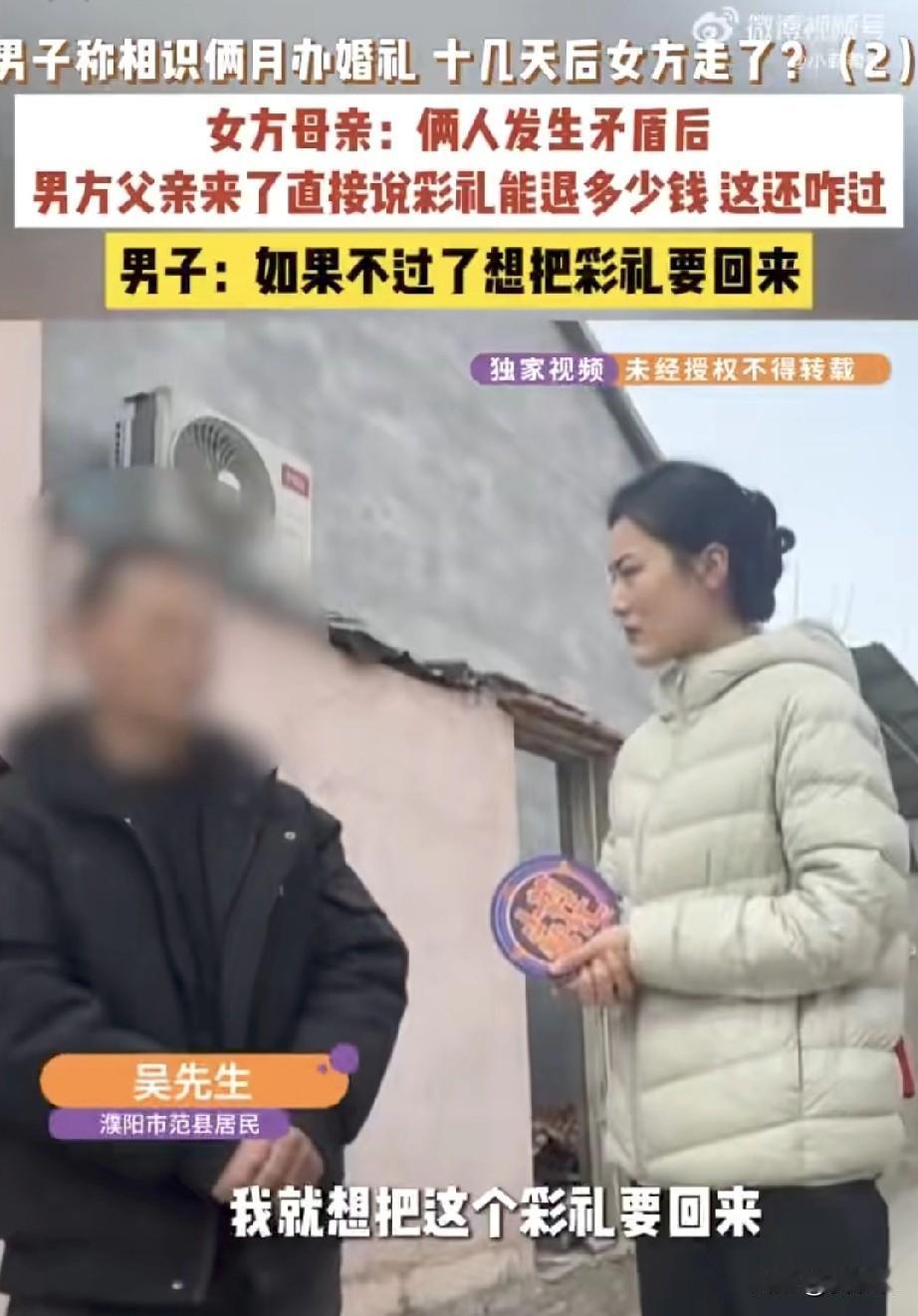 二婚夫妻刚结婚,女方就带着20万彩礼回娘家,男方打电话不接,找上门她不见,由于双方没有领结婚证,律师建议男子起诉女方要回自己的彩礼! 河南吴先生,离婚后经人介绍认识了一个也离过婚、还带着两个孩子的女人,两人处了两个月就闪婚了,吴先生为了表达诚意,前前后后花了30多万,包括见面礼、彩礼、买三金和办酒席,但因为女方说买了房才能领证,所以两人只办了婚礼,没领结婚证。 结果婚后刚15天,吴先生外出打工回来,发现媳妇带着20多万彩礼跑回娘家了,电话也不接,吴先生气得不行,要求女子退还彩礼。 而女方那边则说吴先生刚结婚就惦记着往回要彩礼,答应给自己养孩子也没做到,双方闹得不可开交。 律师建议俩人没领结婚证,法律上不算夫妻,所以这彩礼钱女方应该返还,至于具体退多少,得看法院怎么判。 我认为这就是一场缺乏感情基础的闪婚,最后因为钱谈崩了,谁也没落着好!