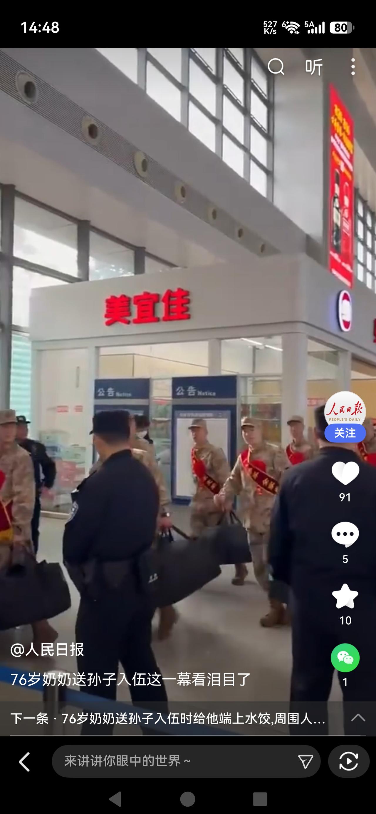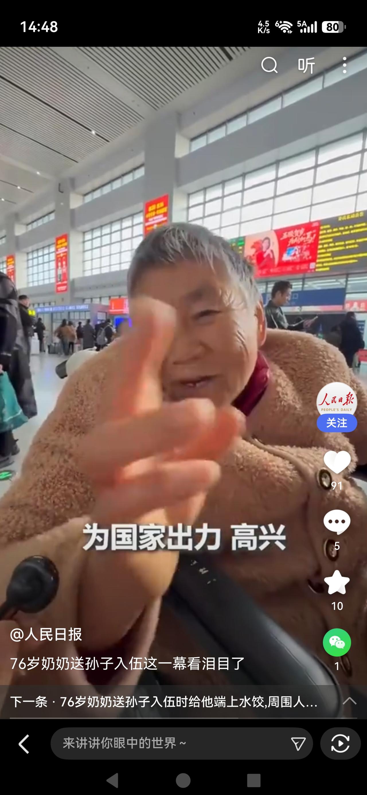 《76岁奶奶送孙子入伍,这一幕看泪目了:家是最小国,国是千万家》 河南许昌,76岁奶奶凌晨起身,亲手包好水饺,颤巍巍送到即将入伍的孙子手中,眼含热泪却笑着说:为国家出力,高兴! 孙子含泪敬礼,祖孙相拥的画面瞬间刷屏全网,戳中亿万国人内心最柔软的地方。这不是普通的离别,是小家牵挂与大国担当的深情碰撞,是普通百姓最朴素的家国情怀,用一碗饺子、一句叮嘱,道尽不舍与骄傲。 看着这一幕,多少人瞬间破防。奶奶的手布满皱纹,却稳稳托举起对孙子的爱,更托举起对国家的信任。她明明满心牵挂,却把眼泪藏起来,只把鼓励和支持留给孩子。这就是中国老人最动人的模样:懂感恩、明大义、知家国,把最疼爱的孙儿,亲手交给国家守护四方。 我们总说岁月静好,可有人要为我们负重前行;我们总说国泰民安,背后是无数家庭把亲人送上征程。这一送,送出的是责任与荣光;这一别,藏着的是牵挂与期盼。奶奶嘴上说高兴,心里比谁都舍不得,可她知道,好男儿就该志在四方,保家卫国无上光荣。 这碗热腾腾的饺子,装的是家常温暖,更是家国大义。这位平凡的奶奶,用最朴实的行动告诉我们:爱国从不是豪言壮语,而是藏在每一次选择、每一份支持里。愿少年不负韶华、建功立业,愿奶奶平安健康,等你光荣凯旋! 这才是最该刷屏的热搜,这才是我们心中的榜样。热点话题 奶奶送孙子入伍 76岁奶奶包饺子送孙子入伍