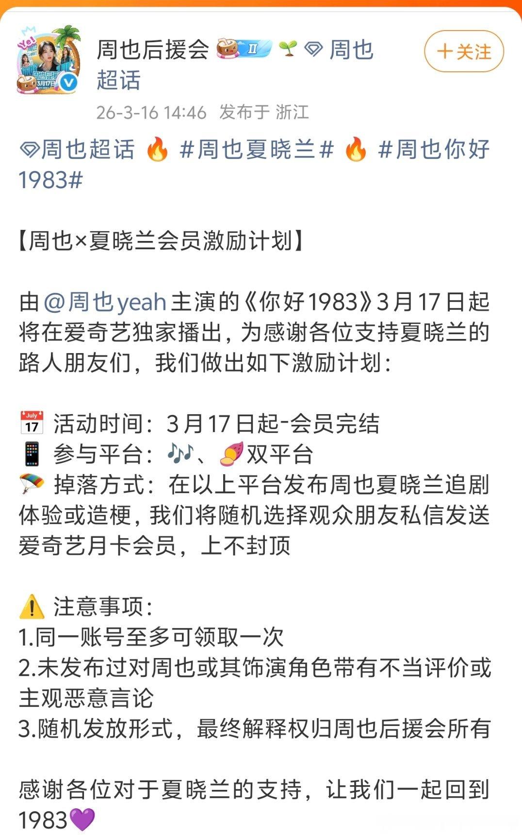 周也粉打响反云包场第一枪,《你好1983》没有粉丝云包场,后援会随机赠送会员给参与讨论的剧粉 ,还有二创奖励机制