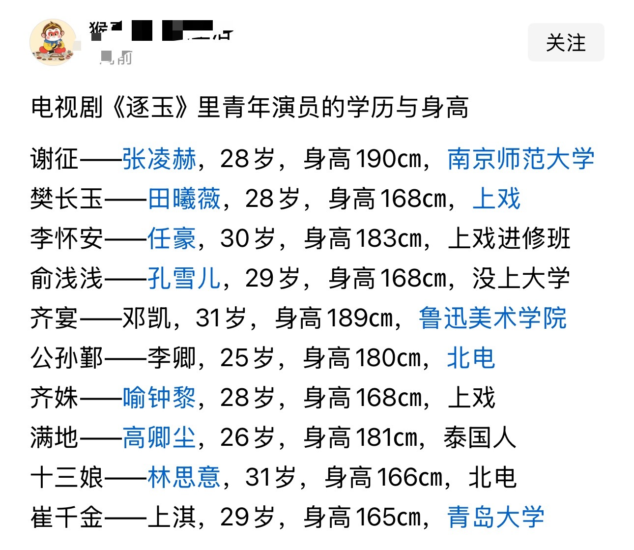 电视剧《逐玉》演员的学历与身高