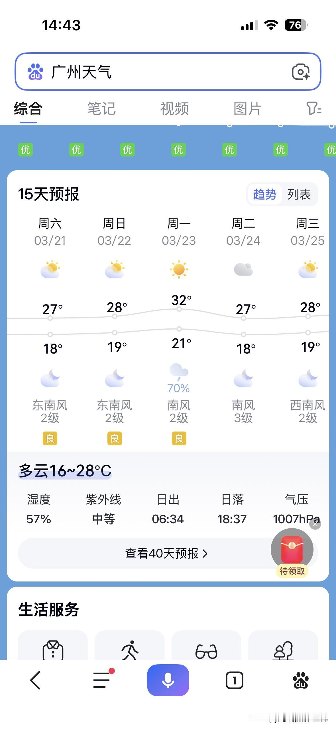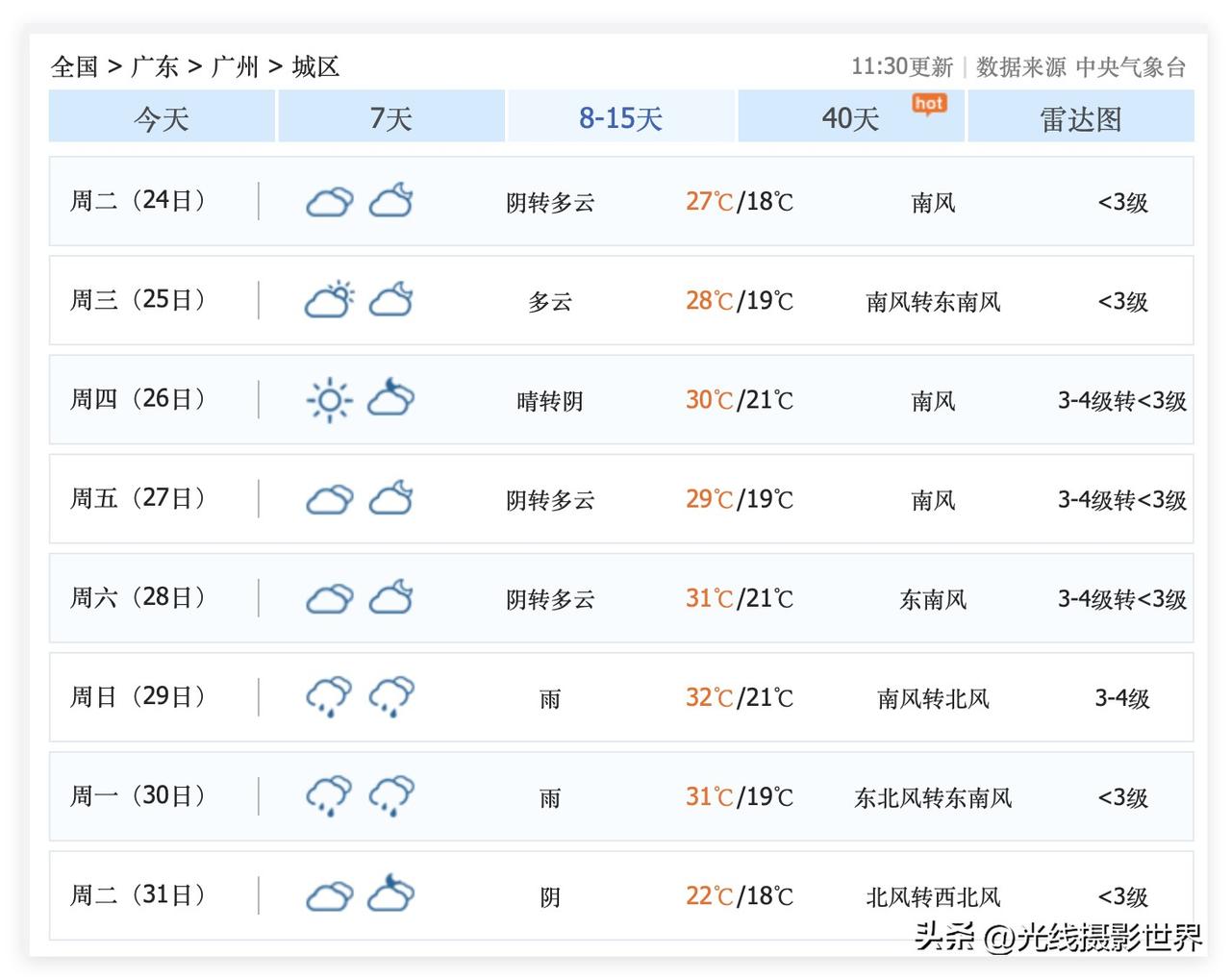 噢!广东省广州市,大家准备好开启空调制冷功能了吗?!3月23日,广州最高气温32度,晴转小雨,对于通风不佳的公寓楼和写字楼来说,估计是必须要开空调制冷了吧?!对于西晒房的下午来说……也许离家出走,找个商场或者图书馆坐一坐会比较好…… 中央气象台的最新天气预报,中长期天气预报大趋势……3月23日到31日,广州市可能会多次冲破30度……广州市,将会迎来真正的纯粹意义上的夏天…… 没想到,今年3月,广州天气,好像真的不一样呢……大家感觉到了吗?!