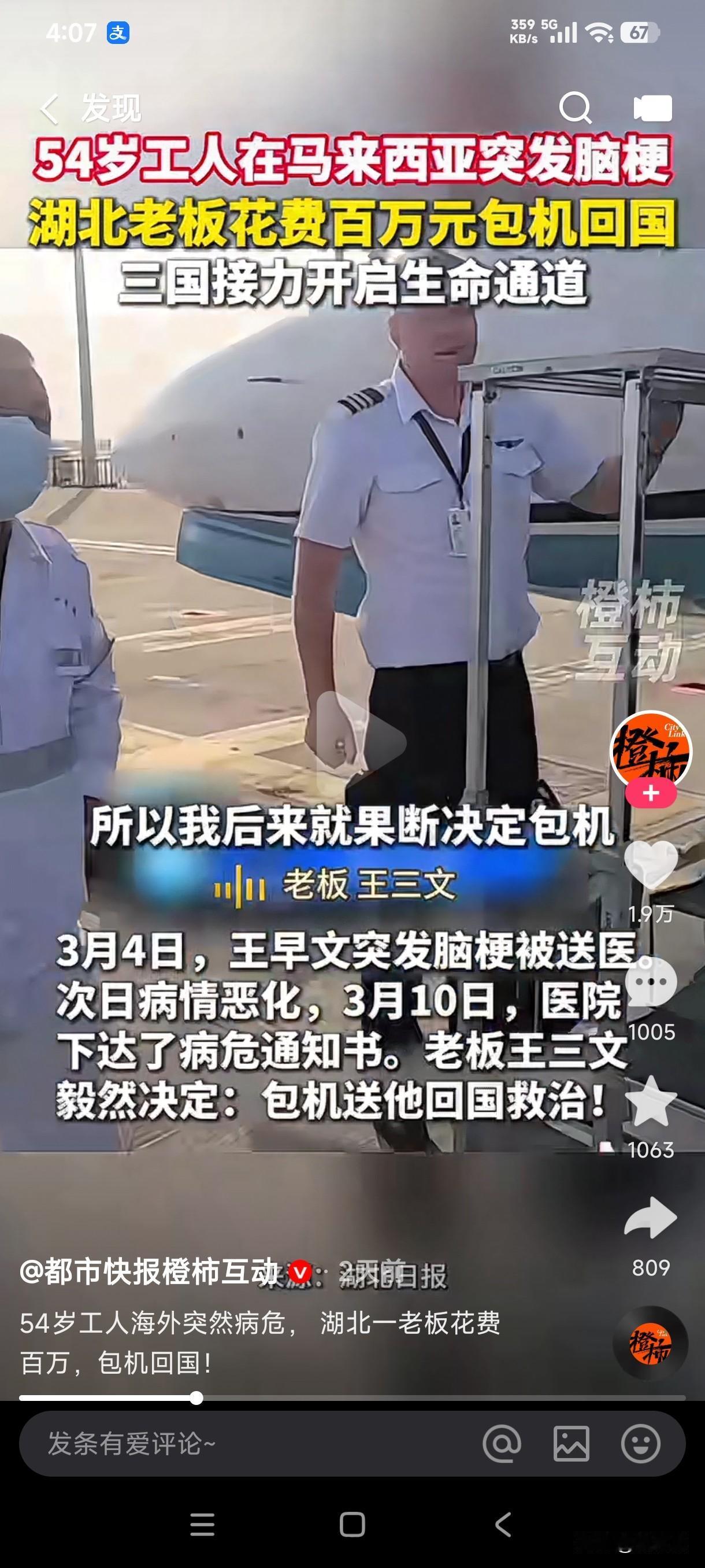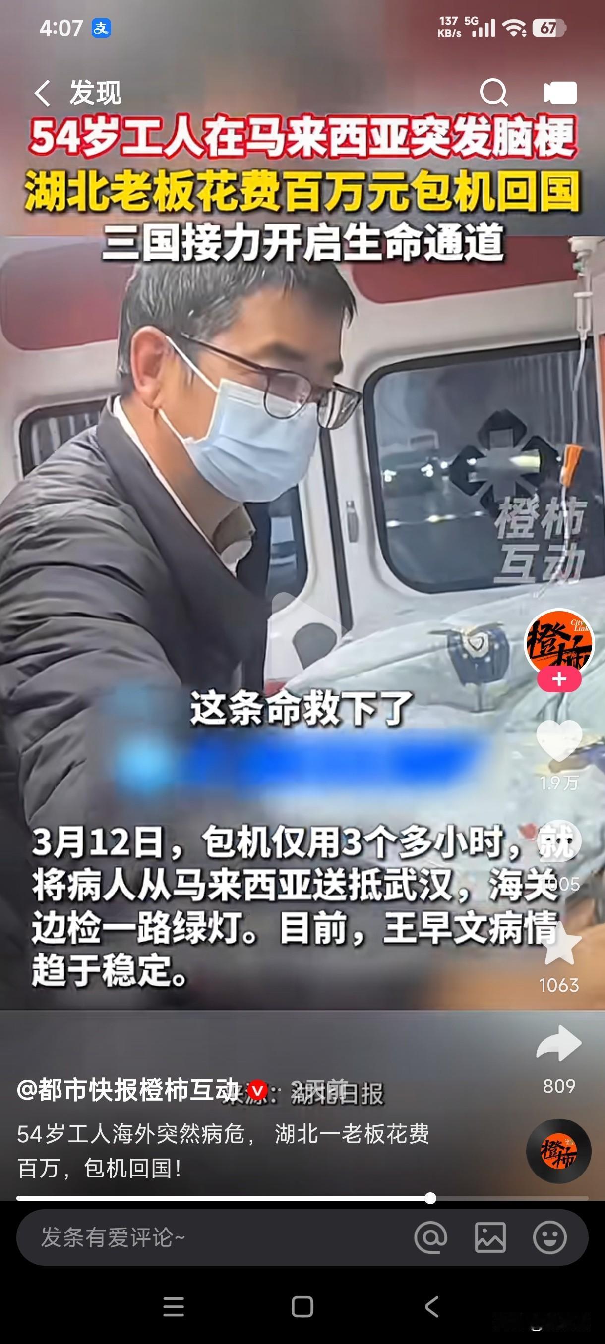 54岁工人在马来西亚突发脑梗,湖北老板花费百万元包机仅用3个多小时从马来西亚抵达武汉,成功救回工人一条命。 这男子上辈子是不是拯救了银河系了,这辈子遇到了这么好的老板,居然不惜花费百万元包专机从马来西亚赶到武汉看病,难道马来西亚的医疗水平还看不了区区一个脑梗吗?不知道为什么要包专机回国看,这样的操作不是多此一举吗,若非是为了以防万一下不来手术台,回国后若是发生意外可以拉回家施行土葬吗?万幸的是男子的命终于被救了回来,这种恩情是不是终生都无法回报?