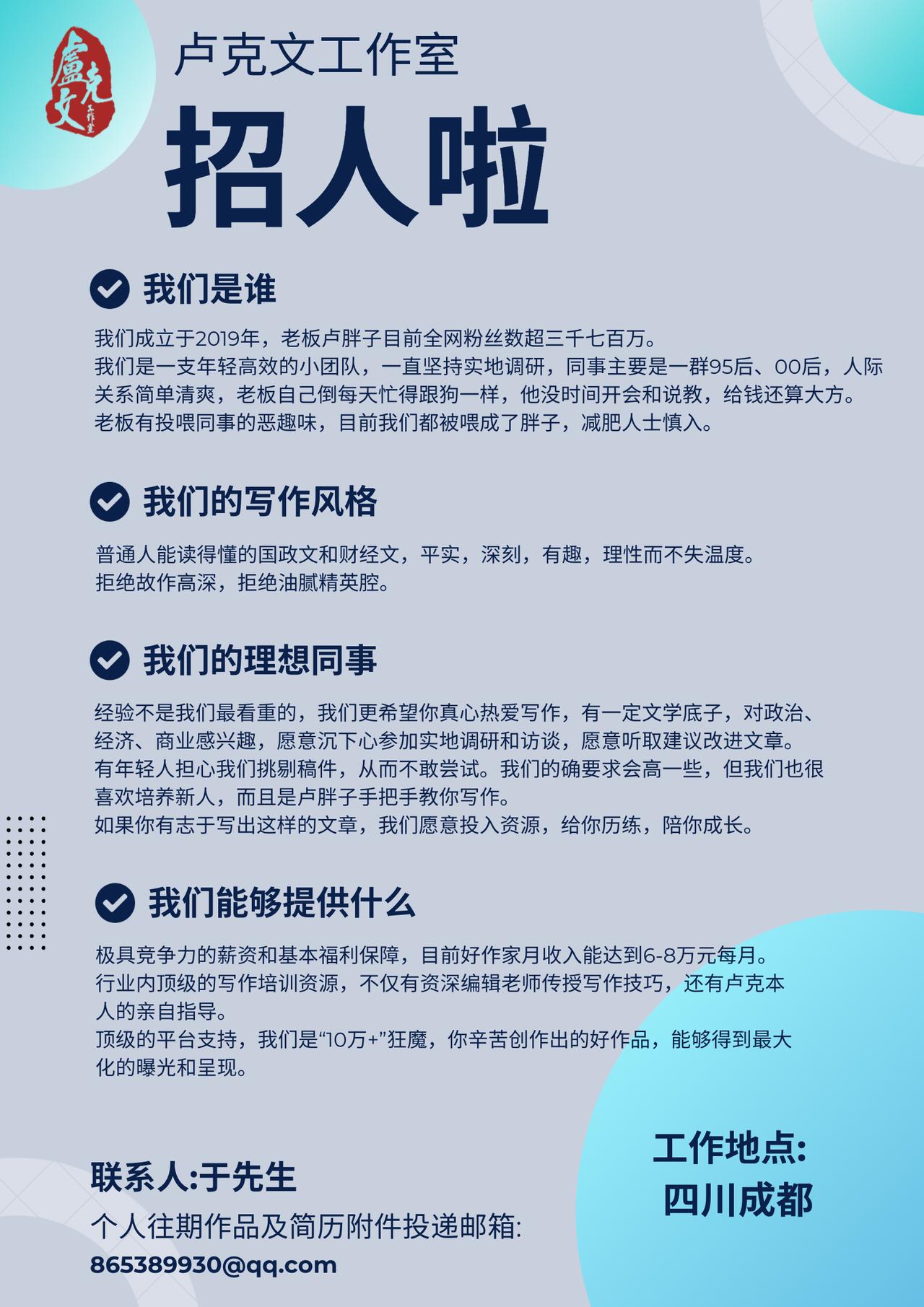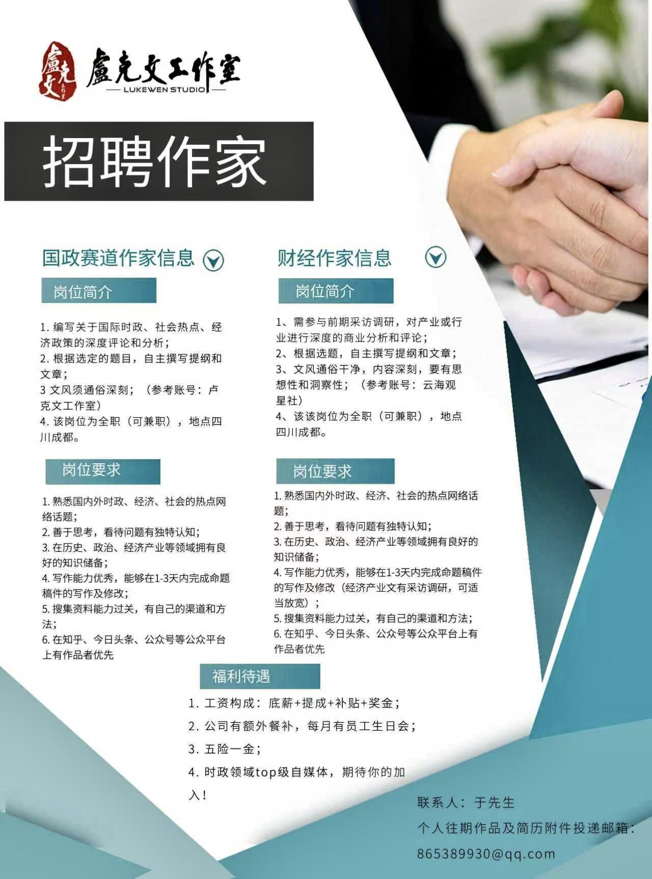 【高薪招聘作家】 岗位:1、国政赛道作家 2、产业财经赛道作家 有能力、有意向的作家可以将【简历】及【作品】发送到邮箱:865389930@qq.com 时政参考账号:卢克文工作室 财经参考账号:云海观星社 (图一是公司办公环境,图二是招聘简介,图三是岗位详情,图四是我们优秀作家的稿费情况。)