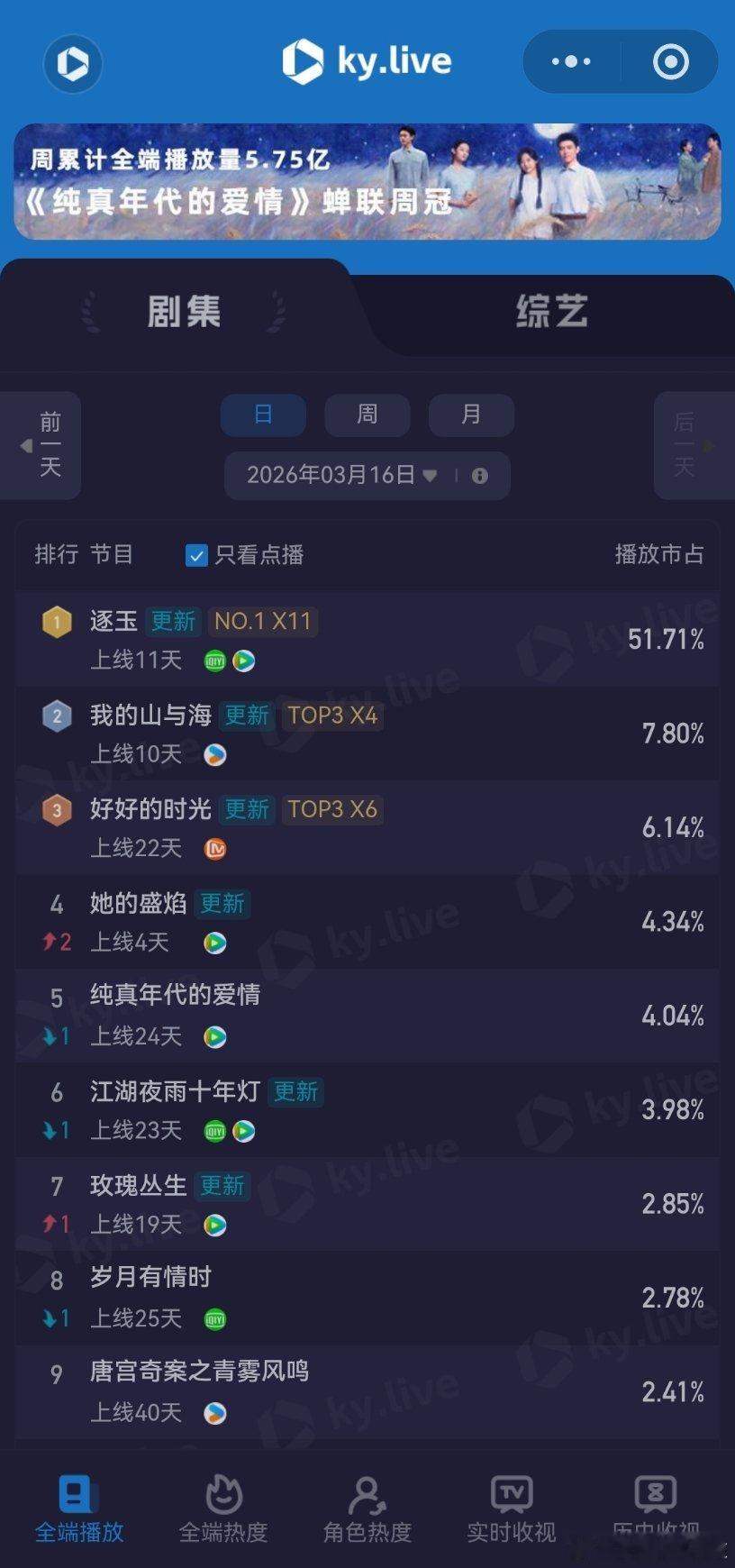 3月16日云合播放占比云合 VS酷云逐玉云合50.7%,酷云51.71%我的山与