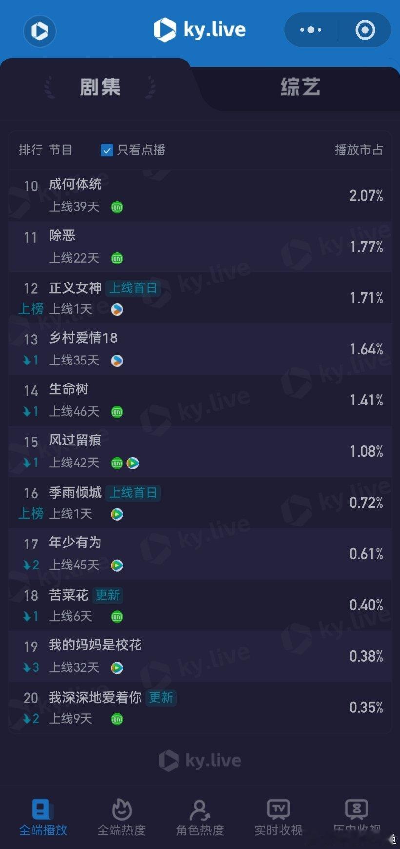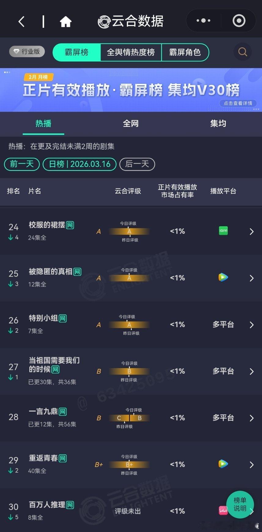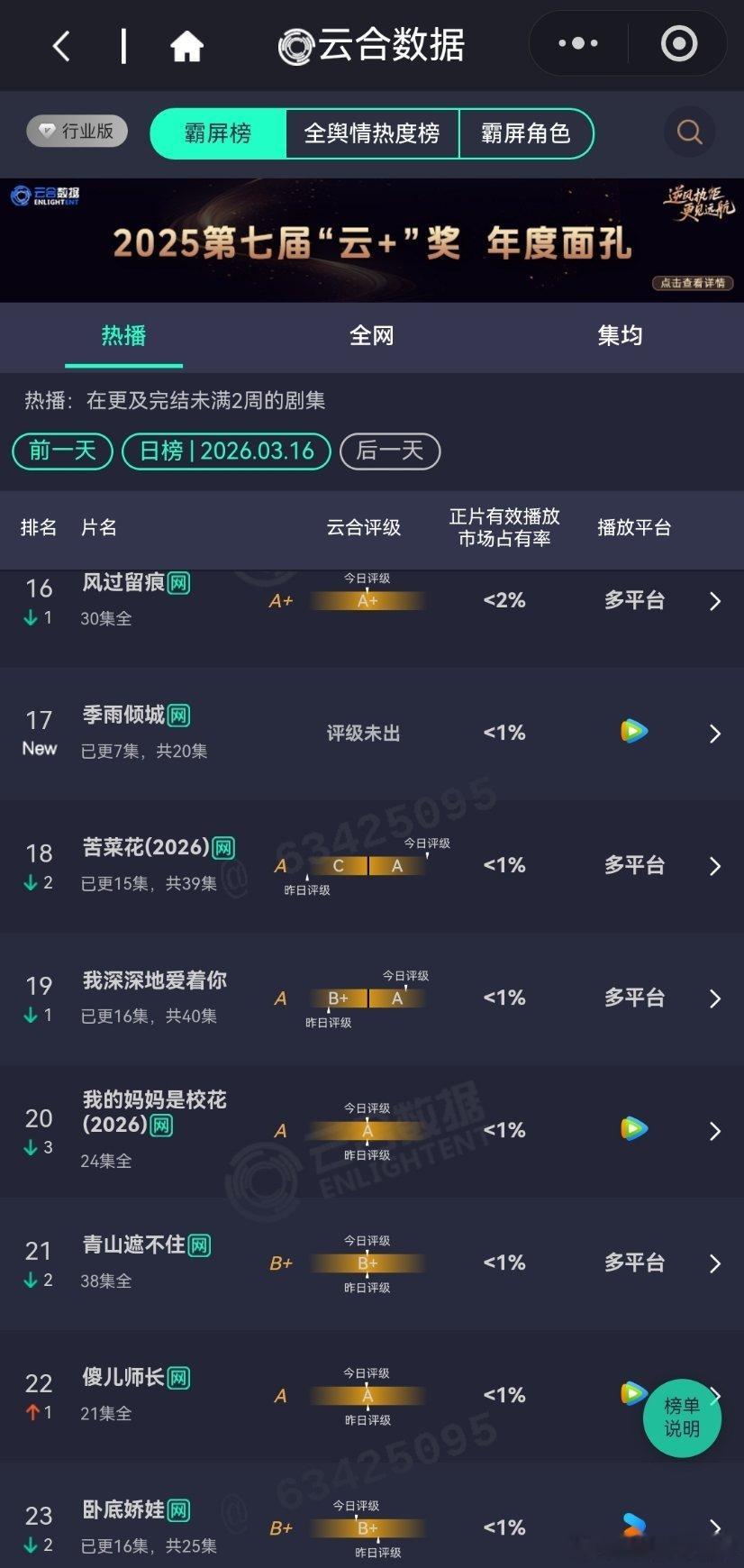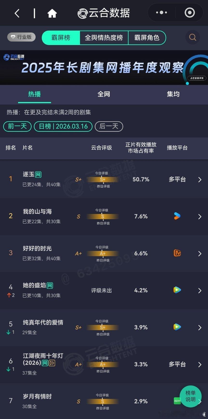 3月16日云合播放占比云合 VS酷云逐玉云合50.7%,酷云51.71%我的山与海云合7.6%,酷云7.8%