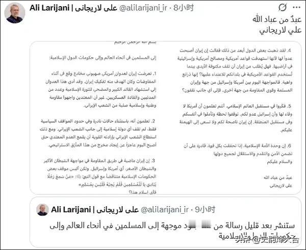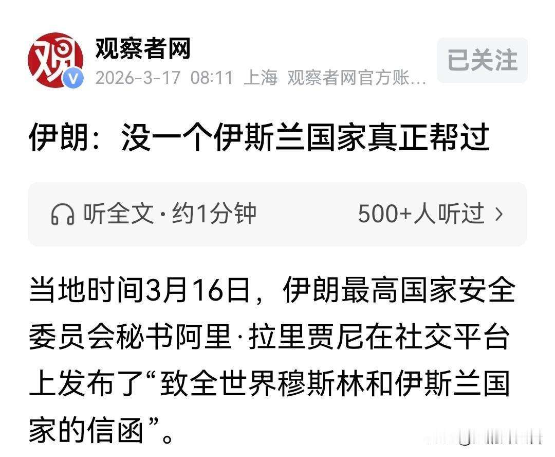 据观察者网消息,3月16号晚上,伊朗最高国家安全委员会秘书拉里贾尼,在社交平台公开发了一封给全世界穆斯林和伊斯兰国家的信。 信里说得明白,伊朗之前和美国、以色列谈判的时候,对方从一开始就没安好心,玩的是欺骗性的攻击手段,打的是把伊朗拆散开的主意。只是伊朗人硬气,硬生生把这些算计顶了回去,反倒让对方陷在里面脱不了身。 说完和美国、以色列的交锋,拉里贾尼话锋一转,对着一众伊斯兰兄弟国家说了直白的话。 他说,除了极少数国家,没有哪个伊斯兰国家真的伸手帮过伊朗人民一把。就算有出声的,也只是在政治层面喊两嗓子,光动嘴皮子,没半点实际动作。这话讲得一点情面都不留,就像在当面问:平时一口一个兄弟,真到了要出力的时候,人都去哪了? 也有人私下嘀咕,说伊朗现在成了大家的对立面,是因为伊朗动手打了别国领土上的美国基地,还有以色列的目标。对这话,拉里贾尼当场就反问了回去。 他的意思很清楚,难道要伊朗眼睁睁坐着,看着美国拿你们国家的基地当跳板,往我这儿扔炮仗?天底下就没有这样的道理。 整封信里最核心的,是拉里贾尼直接摆到台面上的一道选择题。 他把话挑得明明白白:现在摆在眼前的阵势,一边是美国和以色列,另一边是穆斯林和抵抗的力量,你们到底站在哪一边?他还特意提醒,美国对这些伊斯兰国家从来就没有真心可言,今天能给你个好脸色,明天为了自己的利益,说把你卖了就卖了。这话不是吓唬人,是让周边那些心里拿不定主意的国家,好好想想自己以后的路该怎么走。 话说到这份上,拉里贾尼也没把路堵死,最后补了一句软话。 他说,伊朗说这些,全是掏心窝子的建议,没想骑在谁头上当老大。听不听全在大家,但该说的话,伊朗必须说到。他反复强调,只要这些伊斯兰国家能真的抱成团,劲儿往一处使,那大家想要的安全、发展、独立,就都能有着落。 这封信发出来的时间,也刚好踩在了节骨眼上,正好是美英两国对也门胡塞武装动手的空档。 明眼人都看得出来,伊朗这话,表面上是喊给整个伊斯兰世界听的,实际上更多是说给那几个手里有资源、心里打着小算盘的海湾国家听的。大家嘴上都不说,心里都清楚,这地方的局势越来越乱了。伊朗现在站出来把这层窗户纸捅破,就是想告诉那些还想两头讨好的邻居,别再做梦了,火都快烧到眉毛了,到底站在哪一边,该好好想清楚了。 伊朗发这封信,看着是在跟整个伊斯兰世界讨公道,其实是把话说得再明白不过,逼着大家把立场摆出来。 现在美国和以色列的军事压力已经持续了18天,伊朗国内的平民伤亡数字还在往上涨,德黑兰心里也清楚,光靠嘴上的政治声援,根本顶不了事。 这封信与其说是求大家帮忙,不如说是把话说透了:那些还和美国保持军事联系的海湾国家,比如阿联酋、巴林,再想装糊涂、两边不得罪,是不可能了。 拉里贾尼把“不伸手帮忙”的事直接摆在了台面上,让这些国家没法再回避。他真正想问的其实是:如果伊朗的导弹要反击驻扎在你们国家的美军,你们是选择关闭领空,还是眼睁睁看着自己的领土,成了别人动手的跳板? 伊朗走这一步,就是要把美国攒起来的针对自己的圈子搅散,用“伊斯兰团结”的说法,让周边那些还在观望的国家,没法再两头下注。伊朗怒批美国 伊朗领导讲话