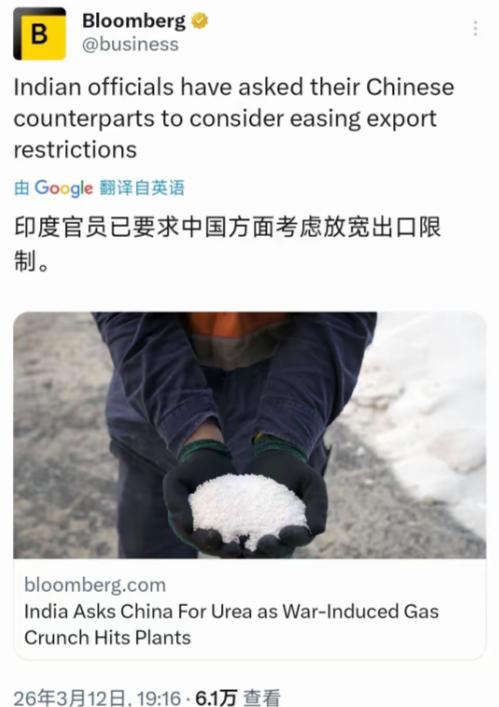 印度警告中国要放开尿素的出口,因为印度需要,印度缺口。印度是全球最大的尿素进口国,现在印度居然想着让中国放松出口限制。 可能很多人不知道,尿素对印度来说可不是小事,毕竟这个国家既是全球第一人口大国,也是第二耕地大国,十几亿人的吃饭问题,全靠国内的农业生产撑着,而尿素就是粮食种植的“命根子”,一公斤尿素就能带动稻谷增产四五公斤,缺了它,农作物大概率会减产,民生都会受影响。 按说印度自己也能生产尿素,年产量能达到3000万吨以上,在全球也能排到第二位,可架不住需求实在太大。 正常情况下,印度每年对尿素的需求至少得3500万吨,这就意味着,每年天生就有500万吨的基础缺口,只能靠进口来填补。 原本靠着中东地区的供应,还能勉强维持平衡,可今年3月以来,一场突如其来的变故,直接把印度逼到了绝境。 熟悉国际局势的朋友都知道,今年3月美伊冲突升级,伊朗为了反制,直接封锁了霍尔木兹海峡,而这条海峡正是全球能源运输的关键通道,承载着全球20%的液化天然气贸易。 更雪上加霜的是,印度主要的天然气供应国卡塔尔,能源设施遭遇袭击,被迫全面停止生产,而卡塔尔的所有能源出口都要经过霍尔木兹海峡,连条备用的陆上管道都没有。 这一下,印度彻底慌了。要知道,印度生产尿素的成本,70%以上都来自天然气,而他们本土的天然气储量严重不足,90%以上都要靠进口,其中大部分就来自卡塔尔。 天然气供应一断,印度的尿素工厂就成了“无米之炊”,多家工厂被迫停产,原本3000万吨的年产量不增反降,直接萎缩了10%。 原本500万吨的常规缺口,硬生生飙升到了800万吨以上,而且距离6月的农业播种季越来越近,要是补不上这个缺口,今年的粮食产量肯定会受重创,14亿人的吃饭问题都可能受影响。 被逼到墙角的印度,开始在全球范围内“求爷爷告奶奶”,到处找尿素货源,他们最先想到的还是中东地区,可中东各国自身也受冲突影响,尿素生产没了原料支撑,根本没有多余的货可供出口。 之后又找了俄罗斯、埃及、沙特等国,可这些国家要么自身产能只能满足国内需求,要么出口有配额限制,要么价格高得离谱,比中国的尿素到岸价高出15%到20%,印度根本承受不起。 一圈找下来,印度发现,全世界范围内,能快速拿出大量尿素、并且价格合理、运输便捷的国家,只有中国。 毕竟中国是全球最大的尿素生产国,年产量能达到7600万吨,占全球总量的三分之一,而且和印度地缘邻近,运费比其他国家低不少,曾经也是印度尿素进口的重要来源。 可印度的做法,实在让人不敢苟同,为了让中国答应放宽出口限制,他们在3月10日突然放宽了对华投资限制,打破了六年以来的管控僵局,宣称中资持股不超过10%且不控股的投资,无需政府事先审批,说白了,这就是想拿最少的诚意,换中国的尿素救命,算盘打得噼啪响。 说句实在的,印度落到今天这个地步,完全是自己造成的,这些年,他们一门心思推行“化肥独立自主政策”,刻意减少从中国进口尿素,转而依赖中东市场,殊不知这种单一的进口渠道,本身就充满了风险。 而且国内的尿素工厂大多是三十年前建成的,设备老化严重,能耗比远超全球平均水平,印度政府却一直不投入资金更新改造,连扩产都做不到。 更关键的是,他们明明知道自己高度依赖进口天然气,却不提前布局备用渠道,一旦出现意外,只能被动挨打,现在倒好,自己的烂摊子收拾不了,就想着让中国来“兜底”,还一副理所当然的样子。 国家与国家之间的合作,讲究的是互利共赢,而不是单方面的索取。印度要是真的想解决尿素缺口问题,与其急着向中国喊话,不如先反思自己的问题:赶紧想办法恢复天然气供应,投入资金升级本土尿素生产设备,拓宽进口渠道,而不是把所有希望都寄托在别人身上。 大家对此有什么看法呢?欢迎各位在评论区留言!