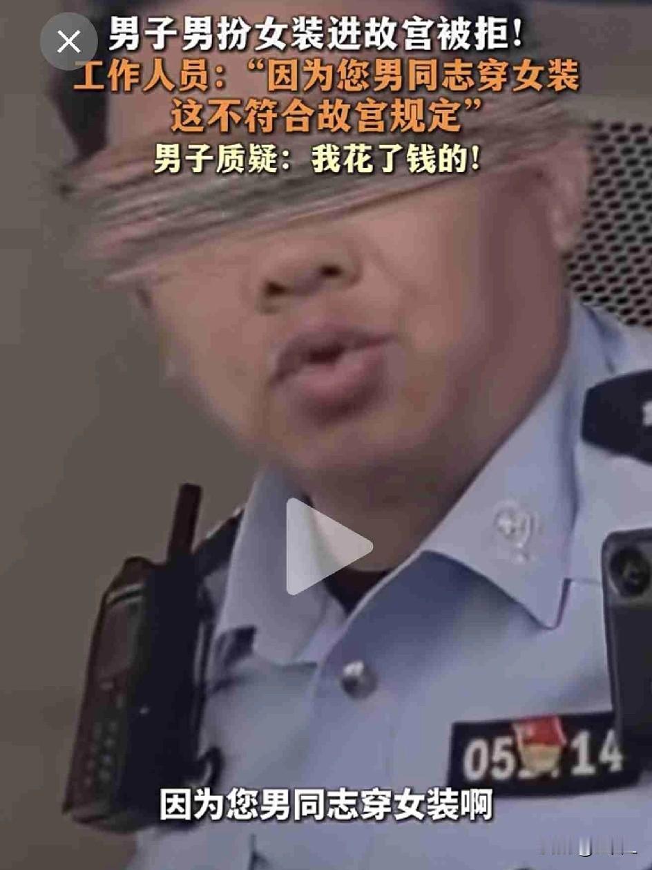 笑不活了!男子男扮女装闯故宫,被当场拦下:花钱也不好使!网友:穿衣自由≠随便穿! 近日,北京故宫门口,上演了一出让人哭笑不得的闹剧。 一男子打扮成女装,大摇大摆想进故宫参观,结果刚到检票口就被工作人员一把拦住,直接拒之门外。 男子当场急眼,理直气壮质问:“我都花钱买票了,凭啥不让我进?” 工作人员一点没惯着,直白回怼:“您是男同志,穿女装不符合故宫规定,就是不能进!你换回男装就可以进了!” 人家故宫《参观须知》写得明明白白:酗酒、衣容不整、奇装异服,一律谢绝入院!工作人员按规矩办事,没毛病。 可这男子愣是不依不饶,反复掰扯,怎么解释都听不进去,属实有点拎不清。 这事一出,网友们直接炸锅,评论区一边倒: “穿衣自由也得分场合,故宫是文化重地,不是cosplay现场!” “支持工作人员,就该拦着!” “花钱咋了?规矩大于一切,奇装异服别来蹭文化!” “故宫是世界文化遗产,中华5千年历史,是庄严肃穆的地方!” “支持警察,支持工作人员,绝对不让进,男可进,女可进,男女不分不可进!” 说白了,穿衣自由不等于随便穿,更加不是无底线! 逛故宫这种顶级文化地标,得守规矩、有敬畏心。穿得奇奇怪怪瞎折腾,花钱也进不去,纯属自找没趣! 素材来源:风芒新闻,侵联删! 带定位晒今日生活 我的今日状态:💰期待暴富 我这里的天气:☀️晴天