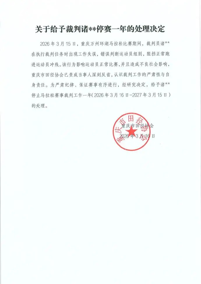 3月16日,重庆市田径协会发布官方处罚公告,对涉事裁判作出停止马拉松赛事裁判工作一年的处罚。