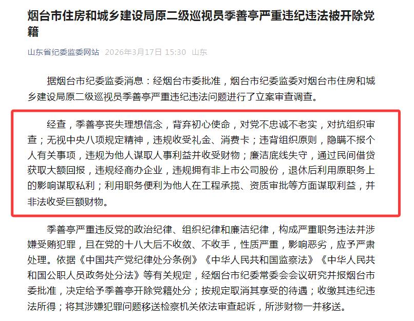 烟台市住房和城乡建设局原局长季善亭,真的是胆大妄为,他竟然退休后利用原职务上的影响谋取私利! 就在刚刚,有关部门公布了这位季善亭具体的严重违纪违法行为,笔者看了以后真是感叹,建设领域有这么位贪得无厌的季善亭,真是让行业蒙羞了;季善亭是在2025年10月落马被查的,期间他不配合调查,不老实交代问题,隐瞒个人事项,导致调查人员花费很多反复取证,这才将季善亭的行为一一查明。 简历显示:季善亭,男,1962年6月生,山东海阳人,中央党校在职研究生;曾任山东省烟台市住房和城乡建设局局长。 笔者看完季善亭的具体严重违纪违法的行为后,我发现他真的是一位贪得无厌的人,退休以后仍不收手,用组织的话说,就是他“退休后利用原职务上的影响谋取私利”,领导干部在职在任时候为人民服务,退休以后就干干净净卸任,不拖泥带水,这才是对自己和对人民最大的负责。 反观这位季善亭,他眷恋手中权力所带来的“好处”,退休后仍旧不肯罢手,利用自身影响力来谋取私利;其实,住房和城乡建设局最大的两个核心权力,一个是当地所有工程的管理,二个是当地工程建设勘察设计、施工监理等单位的资质审批,而季善亭在这两个方面都搞了腐败的利益输送,他利用职务便利为他人在工程承揽、资质审批等方面谋取利益,并非法收受巨额财物。 另外,季善亭的搞钱手段也堪称是“多元化”的,他还搞民间借贷、违规经商、违规拥有非上市公司股份等,种种行为,已经突破了纪律红线,如此贪得无厌实在是令人不齿。 季善亭一共严重违反党的的纪律有:1.政治纪律,2.组织纪律,3.廉洁纪律。本次,经烟台市纪委常委会会议研究并报烟台市委批准,决定给予季善亭开除党籍处分,按规定取消其享受的待遇;收缴其违纪违法所得;将其涉嫌犯罪问题移送检察机关依法审查起诉,所涉财物一并移送。 这下子好了,季善亭的养老退休金没了,要知道,季善亭的二级巡视员可是副厅级的职级,这么高的退休金一下子说没就没了,他的后半生无保障了,以后吃喝拉撒包括看病都得自己掏钱了。