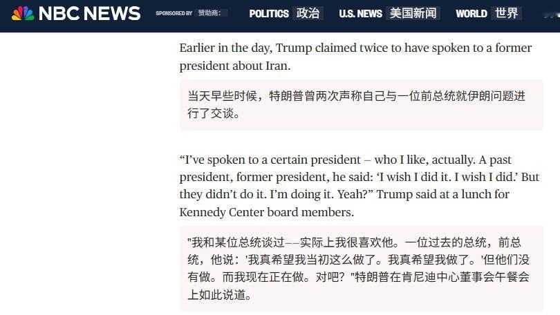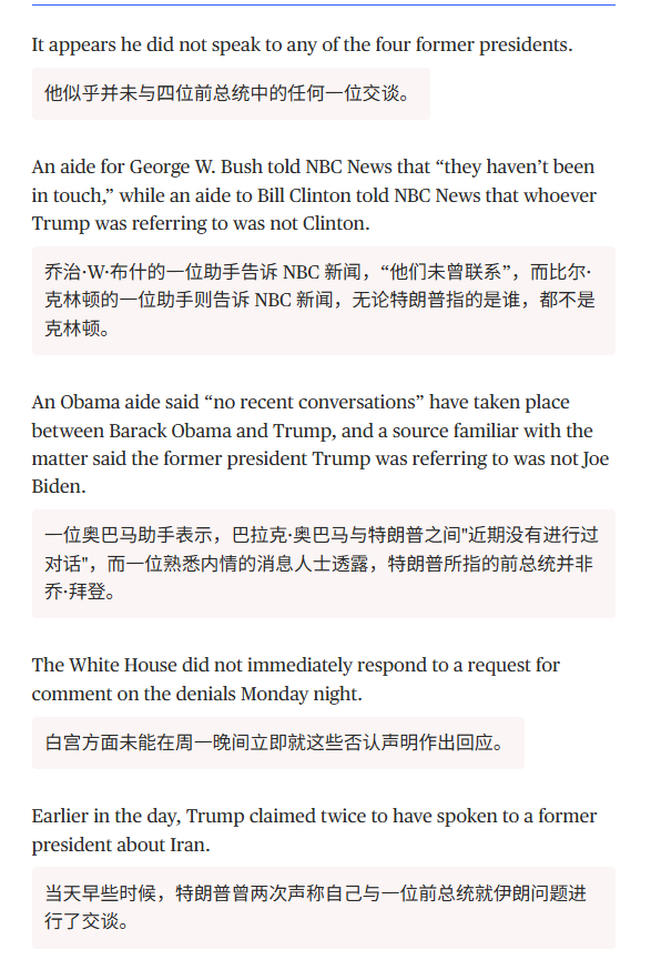 🔻特朗普总统于周一声称,他曾与他喜欢的一位美国前总统就当前对伊朗的轰炸/打击行动进行交谈。特朗普表示,这位前总统告诉他:"我真希望是我做的"(指对伊朗采取行动)。他重复了这一说法,但未透露此人姓名。🔻乔治·W·布什的助手表示他们未曾联系。🔻比尔·克林顿的一名助手表示,特朗普所指的人并非克林顿。🔻巴拉克·奥巴马的助手表示,奥巴马与特朗普近期未曾有过对话。🔻一位知情人士透露,特朗普所指的前总统并非乔·拜登。🔻美国网民目前普遍认为,与第47任美国总统特朗普交谈的前总统,可能是第45任总统特朗普。🔻via NBC 新闻以色列刺杀拉里贾尼伊朗警告日本海外新鲜事中东现场直击