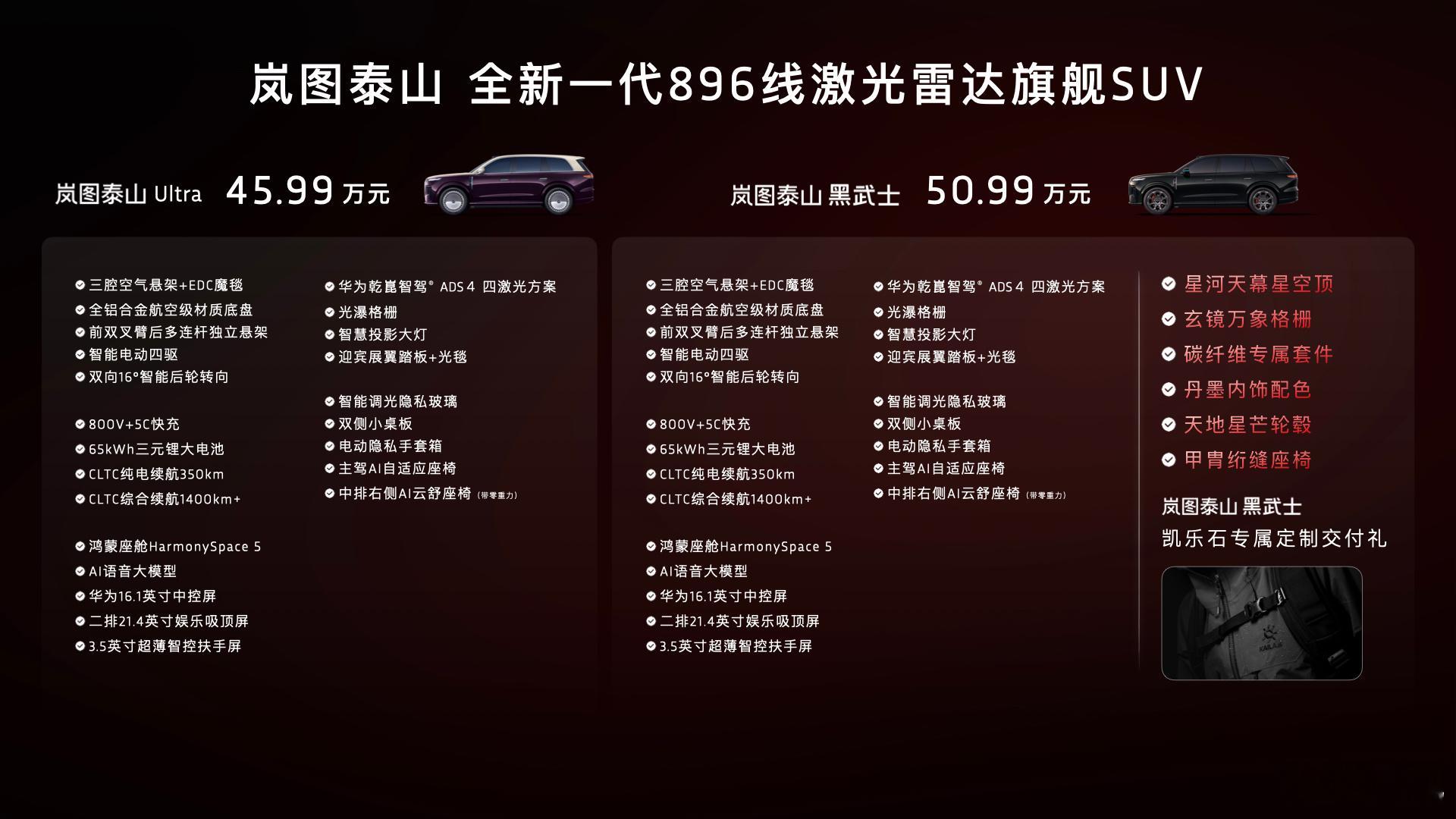 最先用上华为896线四激光雷达的车型,新款岚图泰山售45.99-50.99万元,标配华为乾崑ADS 4.1智驾+鸿蒙座舱5,三腔空悬+EDC魔毯+后轮转向,还给你星空顶调光玻璃等等豪华配置,卖这个价月销多少合理?896线激光雷达全球首秀看岚图泰山全新一代896线激光雷达旗舰SUV