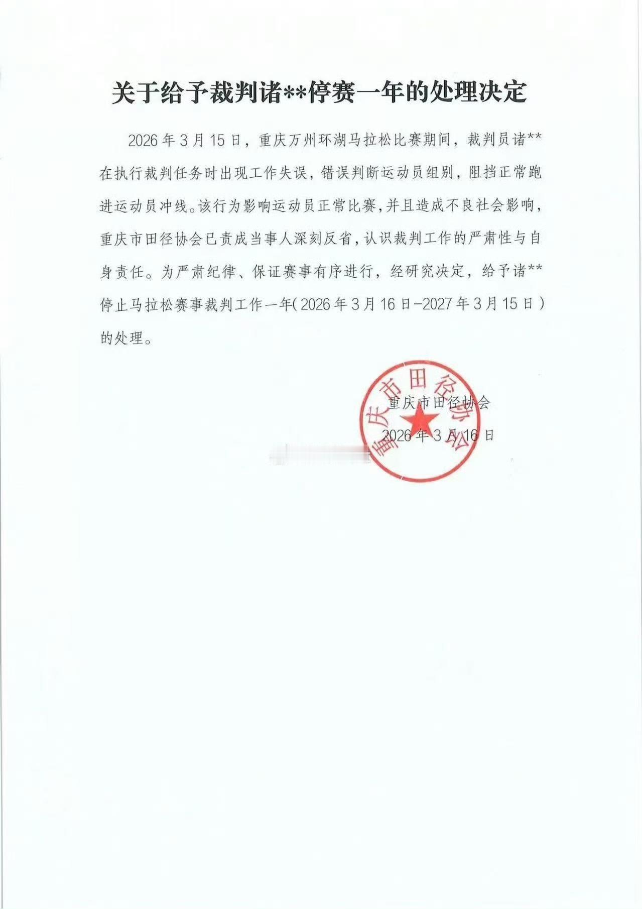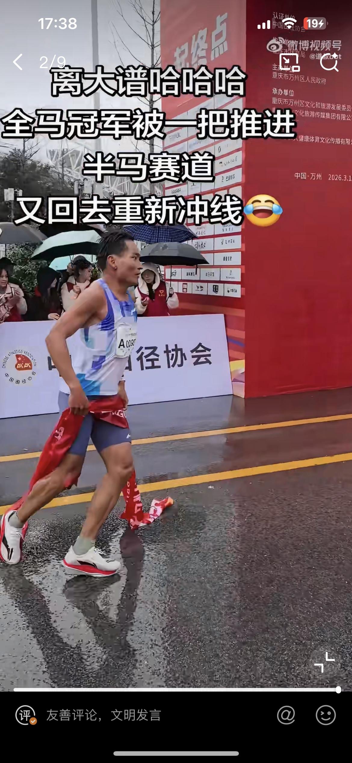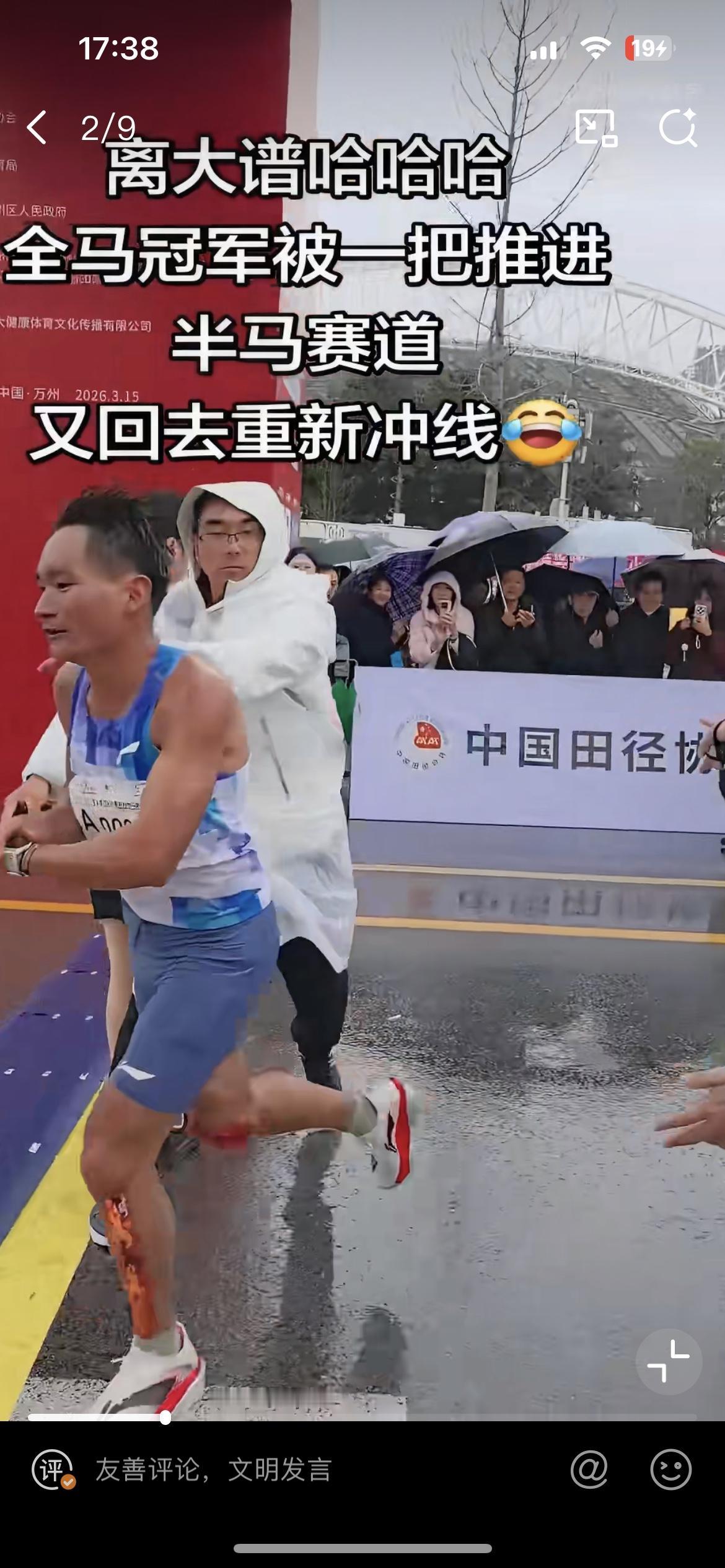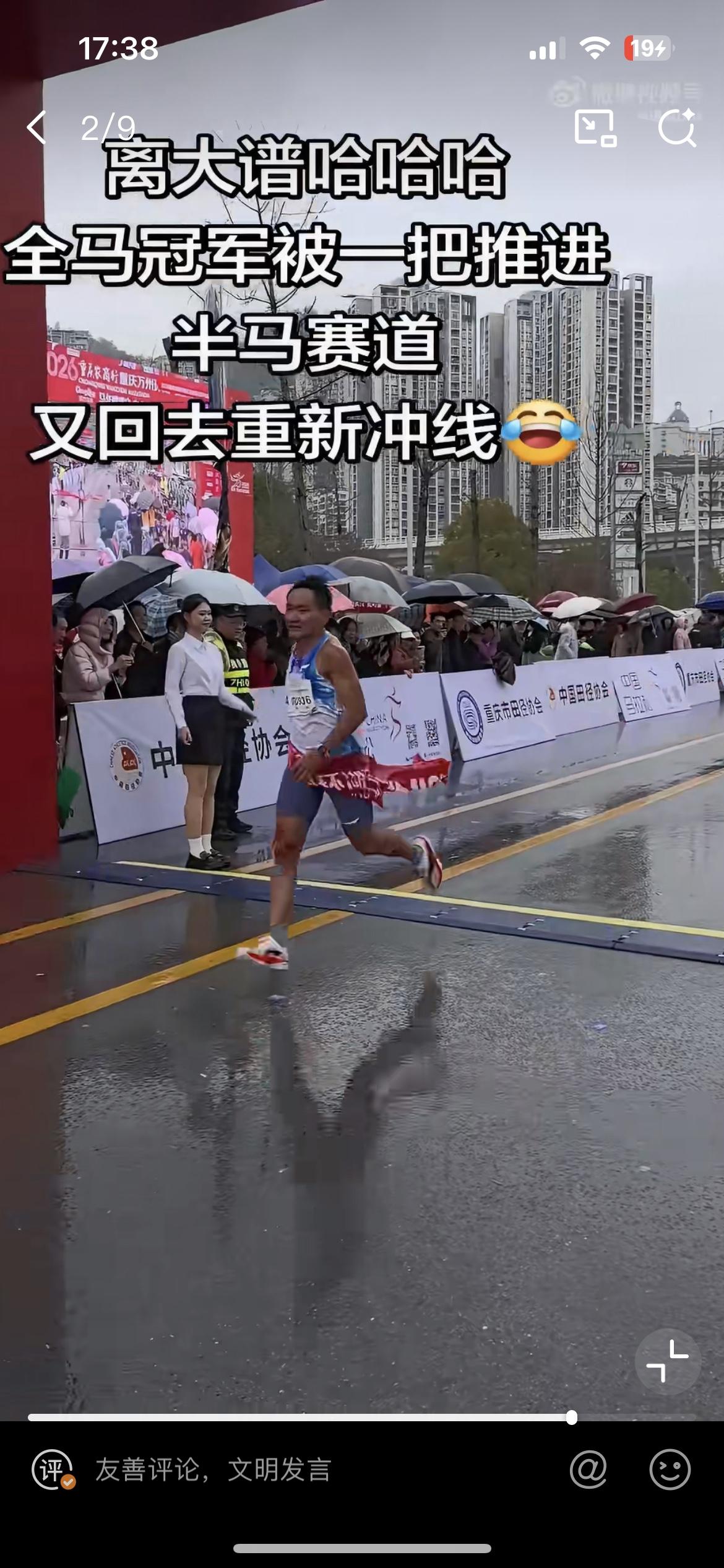 重庆万州的这个马拉松也太草台班子了吧!极其不专业的裁判,差点把人家的冠军都给冲掉了。 3 月 15 日重庆万州马拉松,第一个冲到终点的盛雪李,在即将撞线的那一刻,被一个莫名其妙的裁判给拦截了,这让即将是冠军的盛雪李一脸蒙圈,不知道发生了什么。过了几秒钟当值裁判发现搞错了,又重新让盛雪李去撞线。不专业的裁判遭到一致批评,事后组委会给出的解释是裁判眼睛被雨水打湿看不到,这个解释也太牵强了,那么大个活人,怎么可能看不到?除非眼瞎。