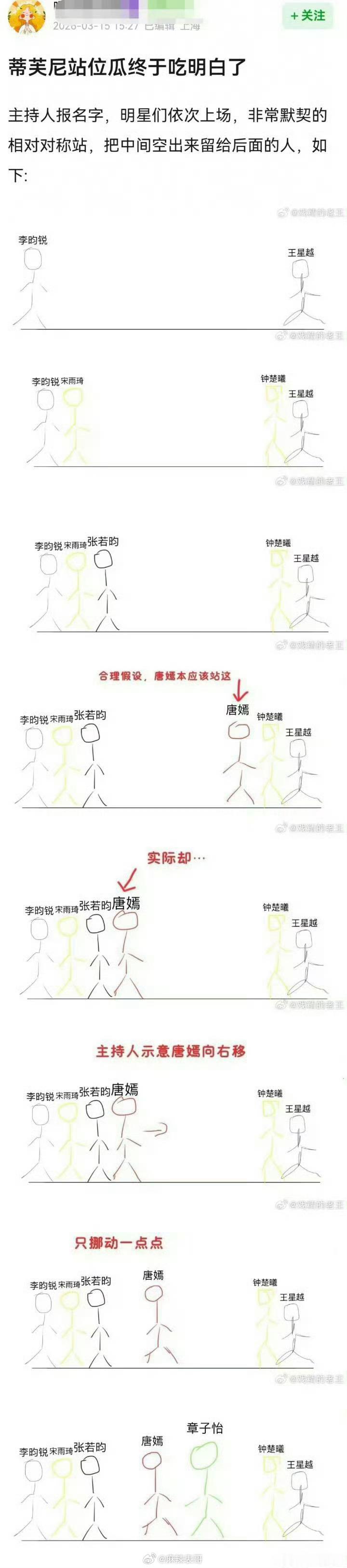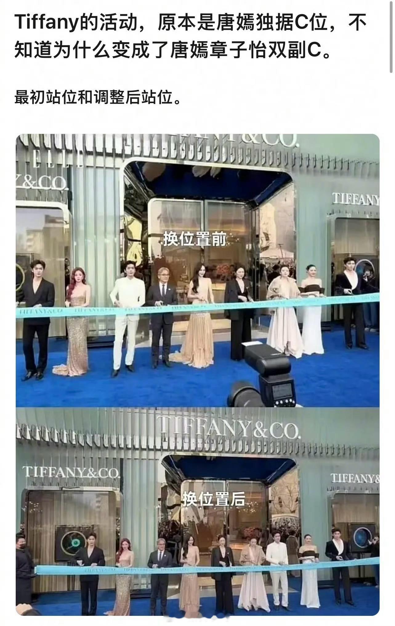 蒂芙尼活动站位出幺蛾子了因为出现了个双副C位唐嫣粉丝说本来是唐嫣的主C(图1但最后官方图是章子怡和唐嫣两个人副C,主C是高管(图4、图5有网友分析了活动现场,猜测最大的可能就是唐嫣走错了,因为之前张若昀走之前都会确认下位置的(图6当时主持人还让唐嫣走过去一些(图7)而且章子怡是全球代言人,唐嫣只是国内代言人(图9你们怎么看?