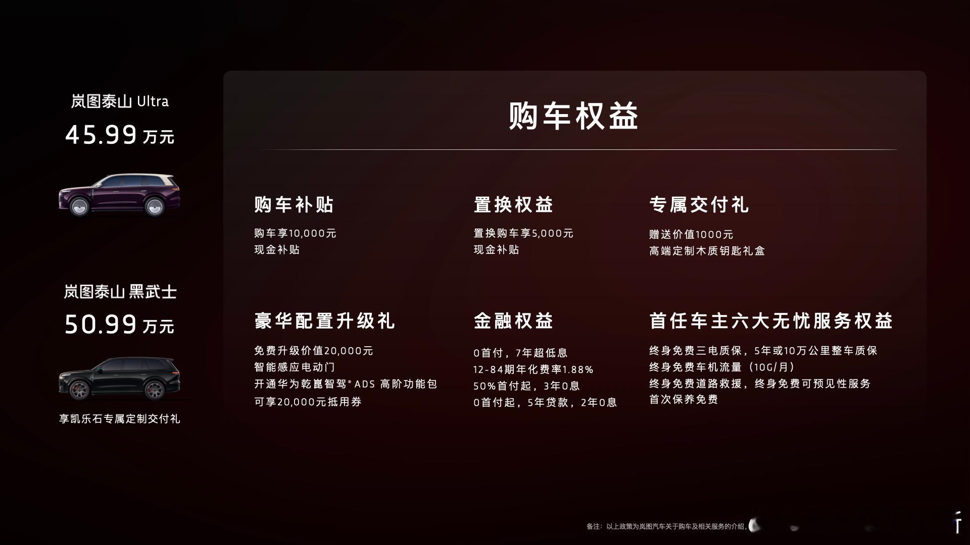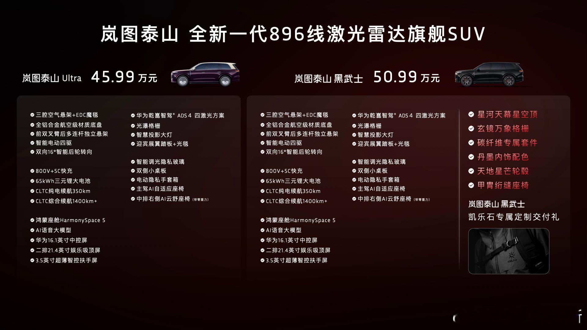 这两个版本的价格也公布了,泰山 Ultra 售价 45.99 万元,黑武士版本售价 50.99 万元。