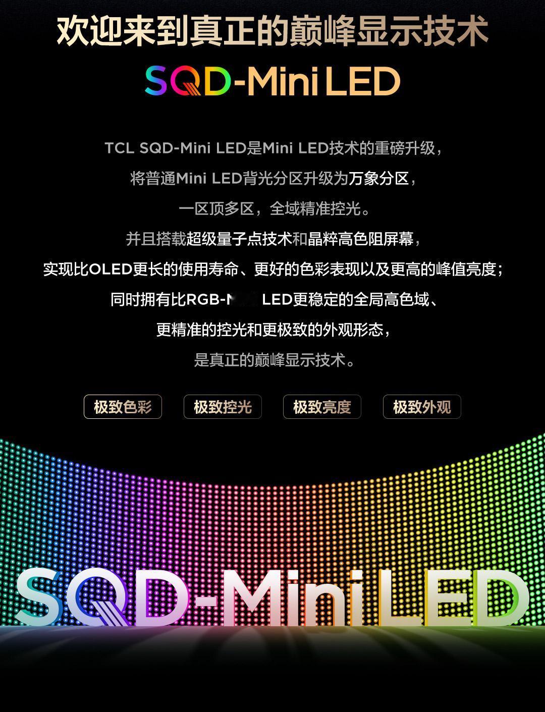 SQD-Mini LED普及元年启幕!TCL Q9M&T7M系列重磅亮相 TCL 2026春季发布会正式官宣,SQD-Mini LED普及元年正式到来!这款曾斩获CES创新显示技术金奖、AWE艾普兰奖金奖,并获得中国视像协会权威认证的革命性显示技术,如今正式下沉至大众爆款系列,让普通消费者也能轻松解锁旗舰级高端画质,真正实现技术普惠,诚意拉满! 事实上,优质画质的比拼从来不止于单一参数,而是对比度、峰值亮度与色域的全方位均衡表现,而SQD-Mini LED正是TCL为消费者打造的“好画质终极答案”。在控光表现上,SQD-Mini LED采用“一灯一分区”的核心设计,相较于RGB技术的“三灯一分区”——需三颗灯才能构成一个有效分区,其在同等成本下的分区数量可达RGB的3倍以上。再搭配TCL自研万象分区技术,实现“一区顶多区”的精细化控光,让画面明暗过渡更自然,暗部细节清晰可辨,亮部纯净无眩光,画面立体感瞬间拉满。 峰值亮度方面,SQD-Mini LED的绚彩XDR亮度并非转瞬即逝的瞬时峰值,而是持久稳定的高亮输出。无论是夜晚街道的车灯、烈日下的反光,还是影视画面中的星云高光,都能被真实还原,即便在高亮场景下,色彩依旧饱满鲜活,不褪色、不泛白。 色彩表现更是堪称标杆,SQD-Mini LED通过超级量子点与超级蝶翼星曜屏的协同作用,实现100% BT.2020全局高色域覆盖,相比传统RGB三原色,色彩更精准、更稳定:红色更纯正浓郁,绿色更鲜翠欲滴,蓝色更澄澈通透。无论是壮阔的自然风光,还是细腻的影视画面,都能最大程度贴近人眼真实所见,长时间观看也不会出现偏色、串色问题。 更令人惊叹的是TCL的技术落地效率,从旗舰机型将SQD-Mini LED技术普及至大众爆款,仅用了127天;而时隔两个月后,TCL再度发力,推出Q9M Pro、T7M Ultra、T7M Pro三款新品,覆盖从轻旗舰到客厅首选的全价位段,国补后五千元档即可入手,用实际行动践行“当技术站上巅峰普惠才有力量”的产品初心。 一直以来,TCL始终致力于推动科技平权,拒绝技术垄断,专注于让高端技术走进千家万户。2026年,作为SQD-Mini LED普及元年,TCL用硬实力证明:好画质从来不是少数人的专属,而是每一位消费者都能轻松拥有的视觉体验!真正好画质,认准SQD电视! 当技术站上巅峰普惠才有力量欢迎进入SQD-Mini LED电视普及元年