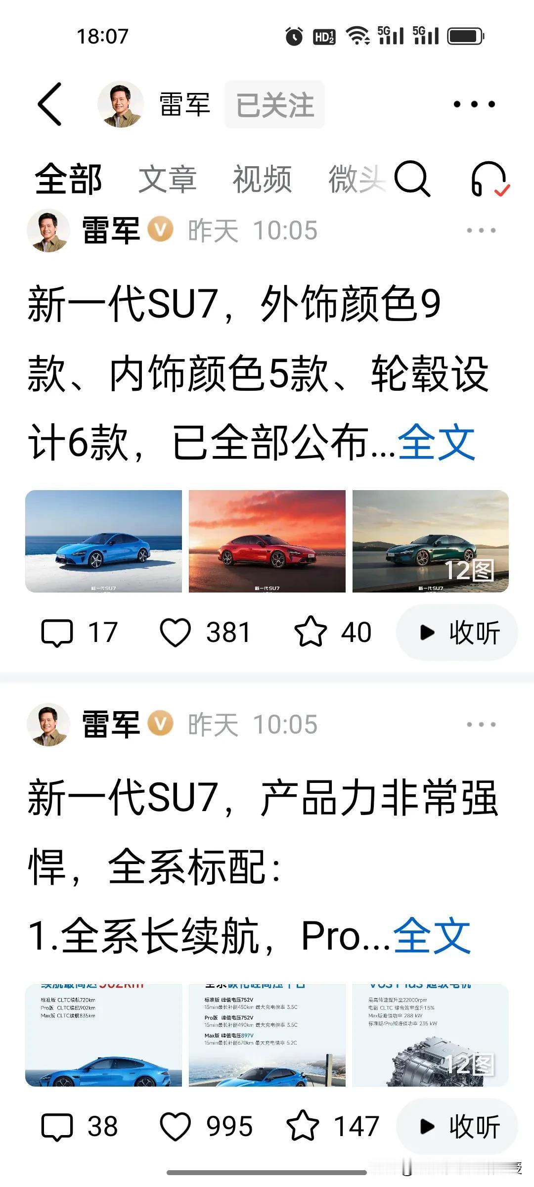 这两天,56岁的小米雷军和57岁的华为余承东几乎在同一时段发布新车。雷军发布新一代小米SU7,而余承东厉害了,一口气官宣了八款新车! 从发文内容看,雷军发了好几条文全面介绍新款SU7,细剖SU7配置卷体验,余承东甩出8款车覆盖全价位,总有适合消费者的一款车,两个人的市场打法完全不同! 今年真是新能源车火力拼市场的关键年,华为靠矩阵量取胜,小米凭细节体验出圈。 华为优势是全场景生态联动,毕竟鸿蒙智行版图铺开后,壁垒会更牢;小米则靠年轻用户粘性追赶,双雄对决注定精彩!