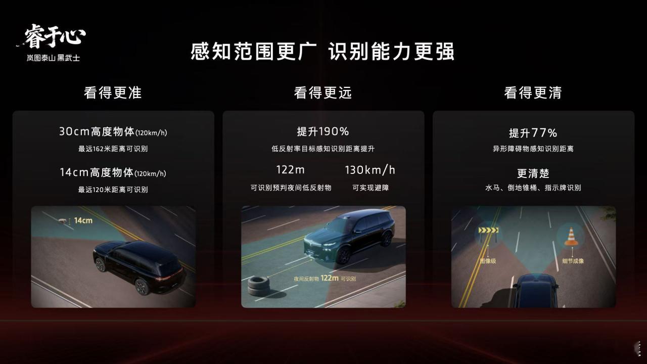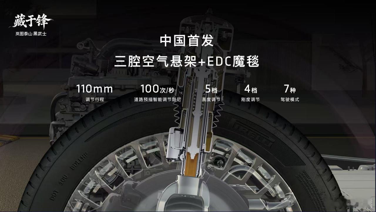 岚图泰山Ultra版:896线双光路图像级激光雷达、前双叉臂+后五连杆底盘结构,首发三腔空气悬架,配合EDC魔毯底盘及双向16°后轮独立转向技术。