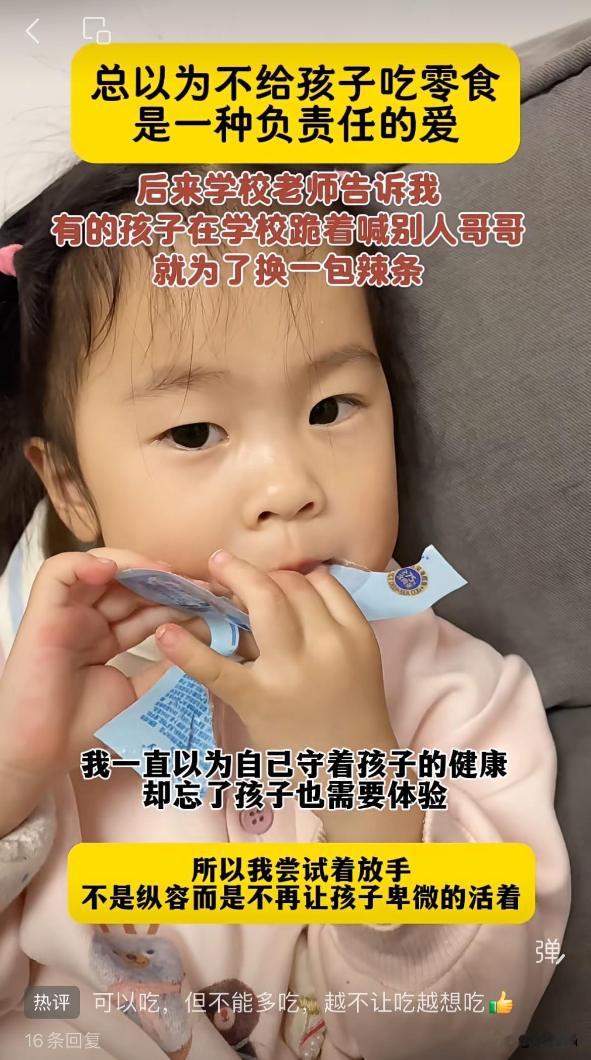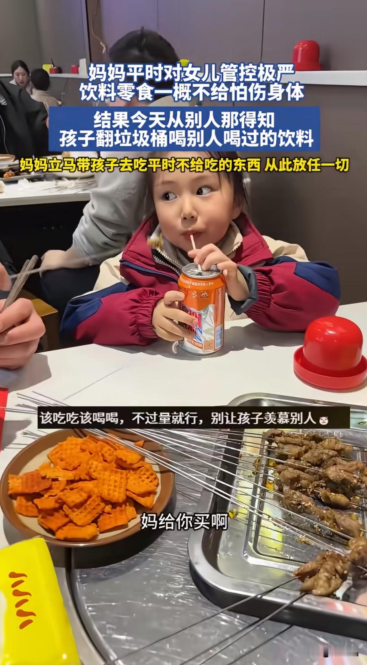 心酸!妈妈管教严,从不给女儿吃零食,却被告知女儿翻垃圾桶,喝别人喝过的饮料,妈妈不敢相信自己一直坚持的育儿观念是错的。 妈妈得知女儿被馋得去翻垃圾桶,顿时感觉自己错了,之前认为自己的育儿观念很好,饮料零食对身体不好,一概不给吃,却忘了孩子童年需要这种体验。 妈妈立马带着女儿去吃平时不给吃的东西,从此放任一切,孩子想吃就让她吃吧,只要不过量就行。 看着女儿抱着饮料,眼里透出的光,妈妈哽咽地问:“以后还翻垃圾桶吗?以后你想吃什么,妈妈给你买。想吃就跟妈妈说,好吗?” 女儿高兴地点点头,品尝着以前没吃过的美味。 一个幼儿园园长分享,很多妈妈都认为自己不给孩子吃零食,这样的育儿观念很好,但环境在这,周边的小朋友都有零食吃,孩子只能看不能吃,馋得不行,甚至会捡皮子藏起来吃,其他小朋友用吃的作为条件,让他干嘛就干嘛。 网友分享自家小孩从小就给她吃,只要适量,就由着她,现在反而她不爱吃零食。 还有网友说,我老公禁止女儿吃糖,大女儿4岁时为了吃糖,跪着喊别人哥哥,我心都颤了,赶紧买一堆糖给她,让她知道糖是甜的,现在她也不喜欢吃糖,所以育儿不能一刀切。 孩子还小,作为家长,我们知道哪些是垃圾食品,哪些对身体有害,总想着禁止孩子吃,却忘了这是童年快乐,孩子需要体验。 其实,育儿是漫长的过程,不能总盯着目的而忘了沿途的风景,看似为了孩子的健康,实则剥夺了孩子童年对小确幸,伤害孩子对事物的好奇和探索欲。 育儿没有对与错,不能盲目复制别人的经验,孩子的成长轨迹都不一样,适合自己的才是最好的,别让孩子成为零食乞丐。 对于零食适当尝鲜,可以选择更健康的零食,培养孩子主食多吃,零食解馋的观念,对任何一刀切的禁止更有成效。 对此事,你怎么看?欢迎评论区讨论。