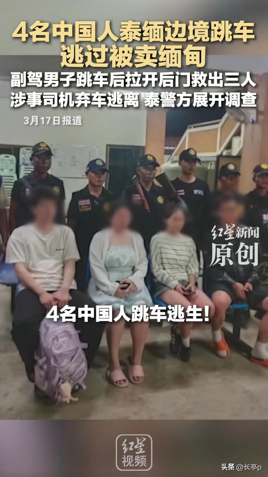 最近4名中国受害者在泰缅边境 跳车逃过一劫,4人向泰国警方说 是被人设局骗到泰国的,泰国人口贩卖团伙原本打算把他们卖到缅甸 坐在副驾驶的男子突然推开车门,从行车上下来,想打开车后门,司机却猛然加速,但没有成功,其余三人赶紧下车,随后向当地警方报案 在当地警方协助下购买了长途车票,前往曼谷,中国大使馆随即接手 此事件再一次警醒大众,千万不要被所谓的人设迷惑,那些出手大方的陌生人,心里早就盘算好了,一些人很容易上了他们的糖衣炮弹的当 泰缅以及老挝哪有什么高薪工作,电诈知识天天宣传,奇怪的是还会有人上当