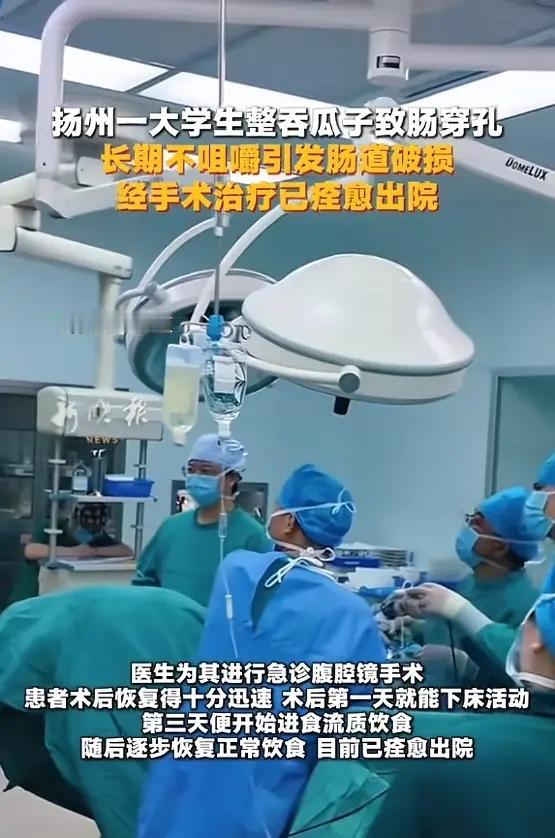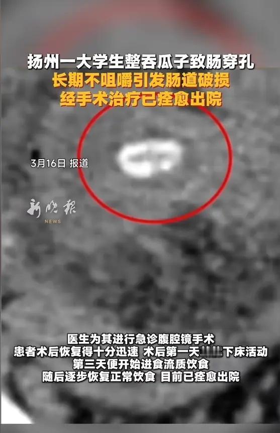 “悲剧还是发生了!”近日,江苏扬州,一男子时吃瓜子时习惯直接吞咽,很少咀嚼,结果腹部突然剧痛,被送往医院就诊后,医生确诊为罕见的肠道畸形部位穿孔,而罪魁祸首,就是他吞下的一枚完整瓜子!网友:万万没想到! 男子是位21岁的大学生,平时就爱嗑瓜子解闷。他有个习惯,嫌吐壳麻烦,常常把瓜子仁连壳一起,或者干脆整颗瓜子直接咽下去。他觉得瓜子那么小,吞下去也没事。 前几天,他右下腹突然疼得厉害,像有刀子在里头绞,没法正常活动。家人赶紧把他送到医院。 医生一开始以为是阑尾炎,给他挂了几天消炎药。可疼痛一点没减轻,反而越来越重,还开始发烧、恶心。情况不对,家人又把他转到了扬州市妇女儿童医院。 接诊的医生仔细问了情况,听说他有吞瓜子的习惯,心里就有了谱。CT检查也发现,小肠里有个像坚果的异物。 医生判断很可能是一枚瓜子,卡在了他肠道里一个叫“美克尔憩室”的先天薄弱部位,把肠子磨穿了。 医生马上安排了急诊手术,腹腔镜伸进去一看,果然回肠末端有个先天性的小“口袋”已经烂穿了,周围全是脓液。手术切下这个病变的憩室,切开一看,里面躺着一枚完整没消化的瓜子。就是这么个小东西,差点要了他的命。 这个“美克尔憩室”是娘胎里带出来的,像肠子上多长出来的一个小盲袋。大约100个人里就有1到3个人有,很多人一辈子都不知道。 平时它很安分,可一旦有硬物掉进去,卡在里面,天天摩擦,日子久了就能把薄薄的肠壁磨破,引发腹膜炎。 小伙子算是幸运的,手术很成功,恢复得也快,没多久就出院了。但这场无妄之灾,本可以避免。 我们很多人吃东西图快,狼吞虎咽。觉得瓜子、花生这些小东西,吞就吞了,身体能处理。可身体不是铁打的,它也有脆弱的地方。 这次是碰巧卡在了畸形的憩室里。就算没有憩室,整吞硬物也可能划伤食道,堵住肠道,一样危险。 细嚼慢咽,老祖宗传下来的话,肯定是有道理的。这不光是礼仪,更是对自己身体的负责。 特别是家里有孩子的,更要看好。小孩好奇心重,容易误吞东西。像纽扣电池、小磁铁、果核这些,一旦吞下去,后果可能更严重。 身体发出的警报,千万别忽视。持续的腹痛、发烧,别总以为是小事,早点去医院,可能就避免一场大手术。别让一时偷懒,换来一辈子的后悔。 各位读者你们怎么看?欢迎在评论区讨论。 信息来源:《21岁男生习惯整吞瓜子,突发剧烈腹痛,发现一枚完整的、未被消化的瓜子致肠穿孔,引发急性腹膜炎》红星新闻