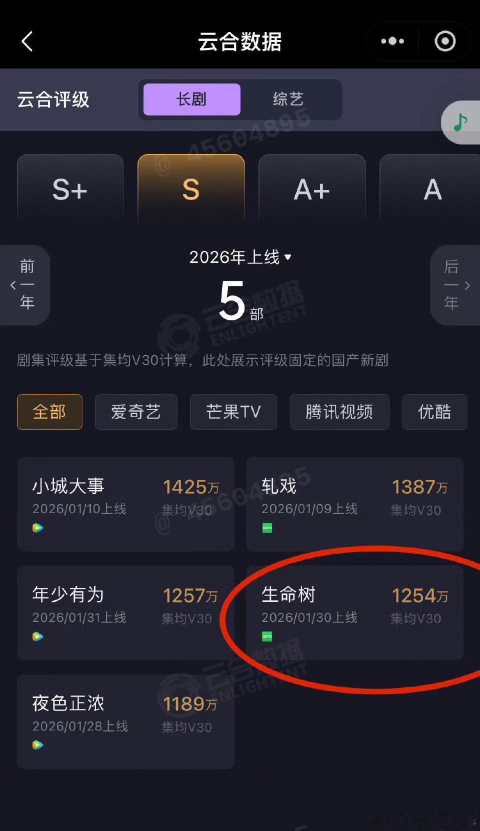 迪丽热巴比杨紫扛剧有意见吗利剑玫瑰集均2557万,生命树集均1254万。