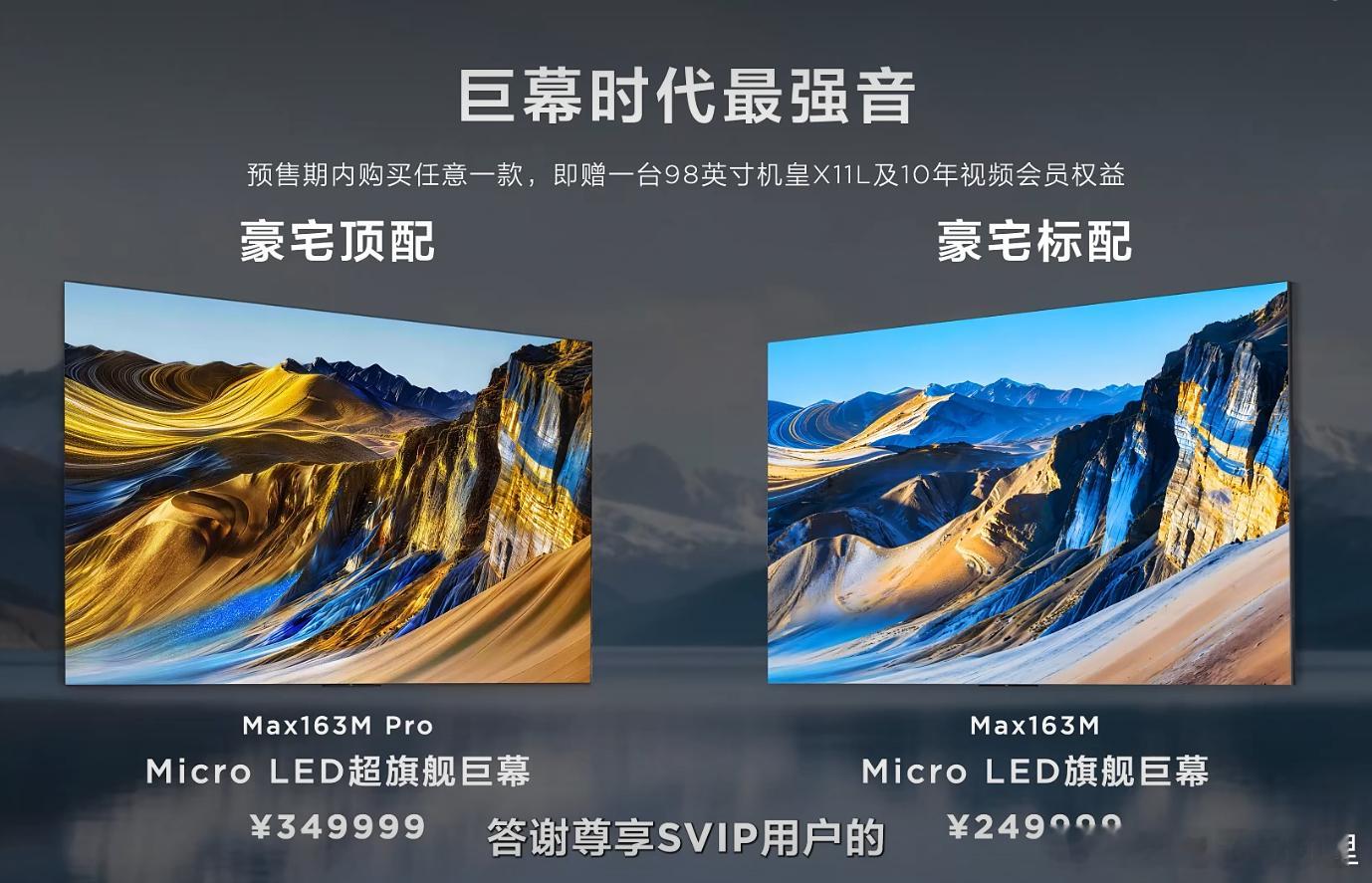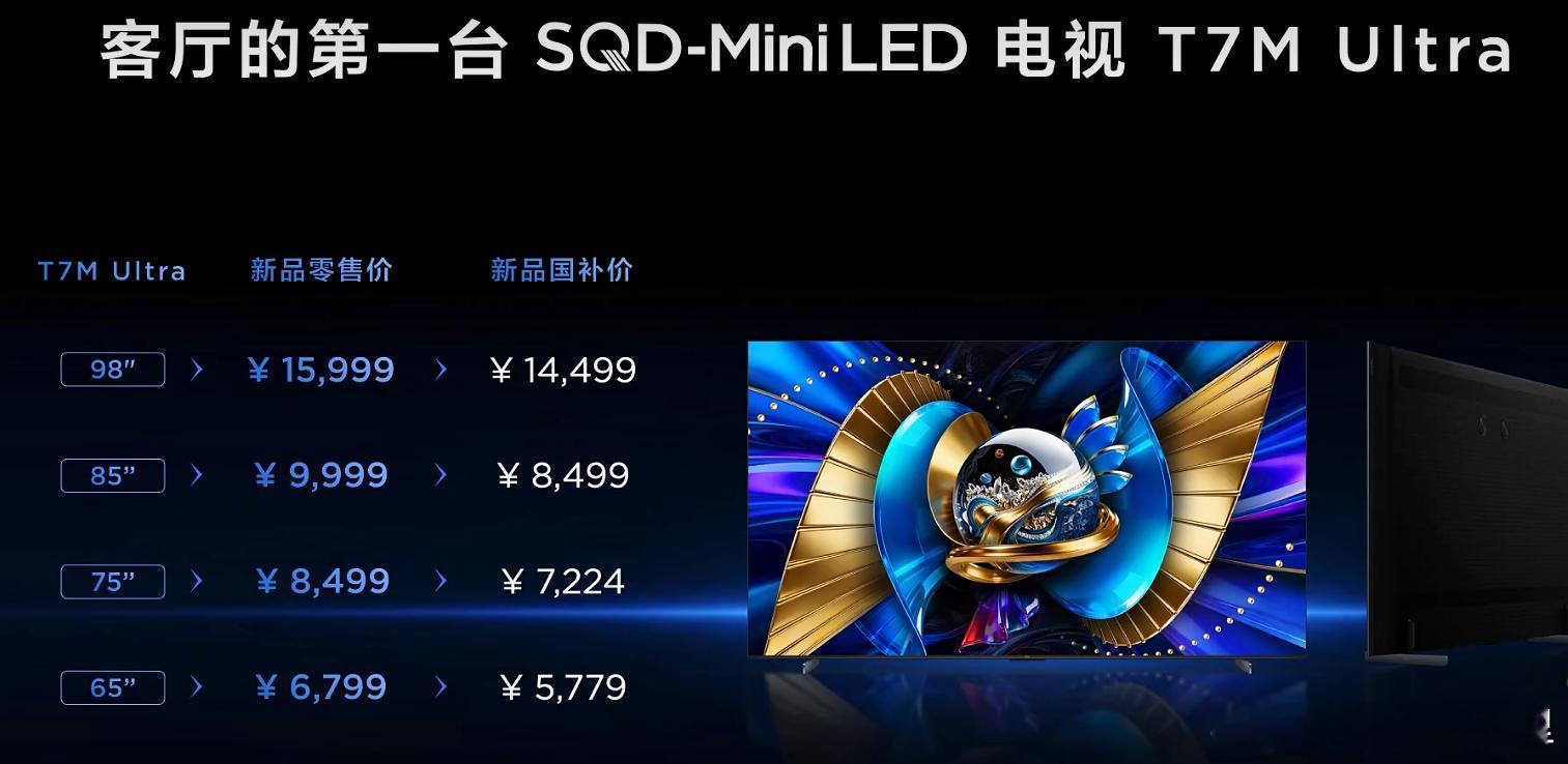 TCL 今天发布了三款SQD-MiniLED 电视,国补后的起售价,Q9M Pro 5269元起,T7M Ultra 5779元起,T7M Pro 5269元起;还带了两个超大彩蛋,163英寸的Micro LED旗舰巨幕,Max163M Pro 349999元;Max163M 249999元。