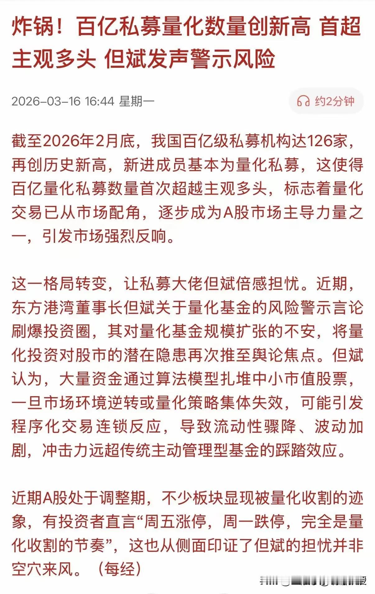 很多投资者问,今天A股走势彻底看懵了,明天会4000点保卫战吗?沪指时隔一年再现四连阴,超4500只个股杀跌,成交量还大幅萎缩。 在欧美股市昨晚都集体反弹的背景下,A股今天的走势确实很不寻常。背后的核心推手,《每日经济新闻》在刚刚盘后发报道称,可能量化资金占据主导。 数据显示,今年2月百亿私募数量创新高,量化规模首次超越主观多头。“吹哨人”但斌前几天就已预警,量化扎堆中小市值,一旦策略集体失效,极易引发程序化连锁踩踏,波动与流动性风险将超乎想象。 当前,市场正处本月第四次底部考验,今天唯有大金融护盘,缩量下散户极易被量化节奏带偏。务必管住手,控制仓位,规避高波动标的,稳住心态,留足“子弹”等市场情绪企稳再布局,别盲目跟风追高。