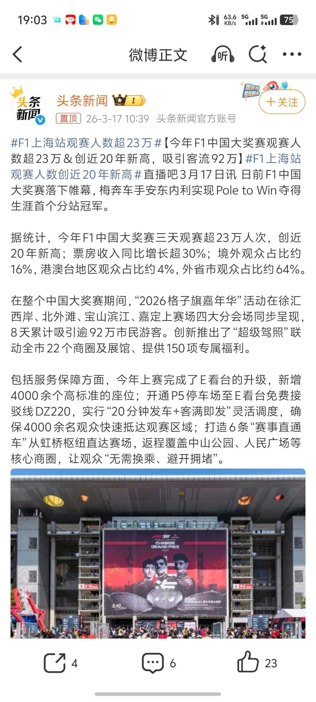 F1上海站观赛人数超23万从24年f1回到中国来,我连续3年都去现场看比赛,人的确是一年比一年多,今年在f1电影和《飞驰人生3》的影响下,热情巨高,就连练习赛的看台,都坐了超多人~
