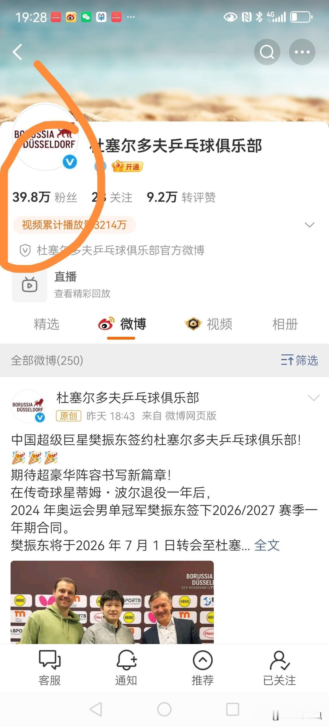 樊振东去哪就关注哪。 关注杜塞尔多夫俱乐部的第一天,粉丝39·8w。(2036年