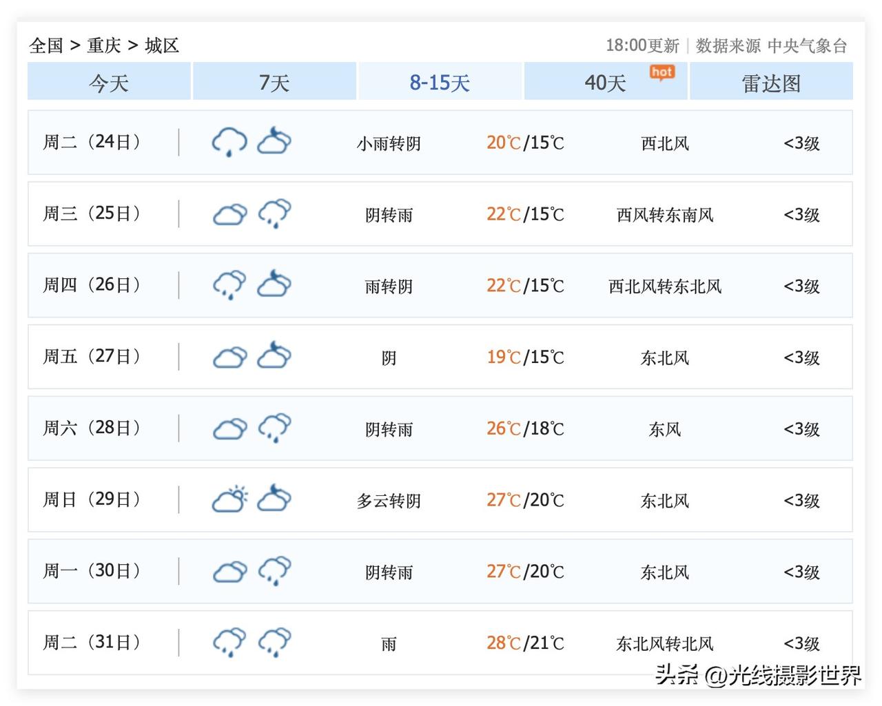 令人开心!3月20日到21日,这周末,重庆主城区,要出太阳啦!太棒了!3月20日,星期五,重庆阴转多云,气温13-19度……3月21日,星期六,重庆多云转小雨,气温15-22度…… 太棒了!中央气象台的最新重庆天气预报,太令人开心啦! 但是,大家一定要注意,一定要珍惜这难得的阳光! 因为,3月22日和23日,重庆可能再次迎来降雨…… 好吧,3月20日和21日,重庆主城区及周边,紫藤花和绣球花、杜鹃花是主流啦! 南山的杜鹃花…… 碧津公园,华岩寺以及璧山和江津的紫藤花……西南大学的紫藤花…… 平顶山公园的绣球花……川外小铁路的绣球花…… 贵州省毕节市的百里杜鹃花……都好美啊!