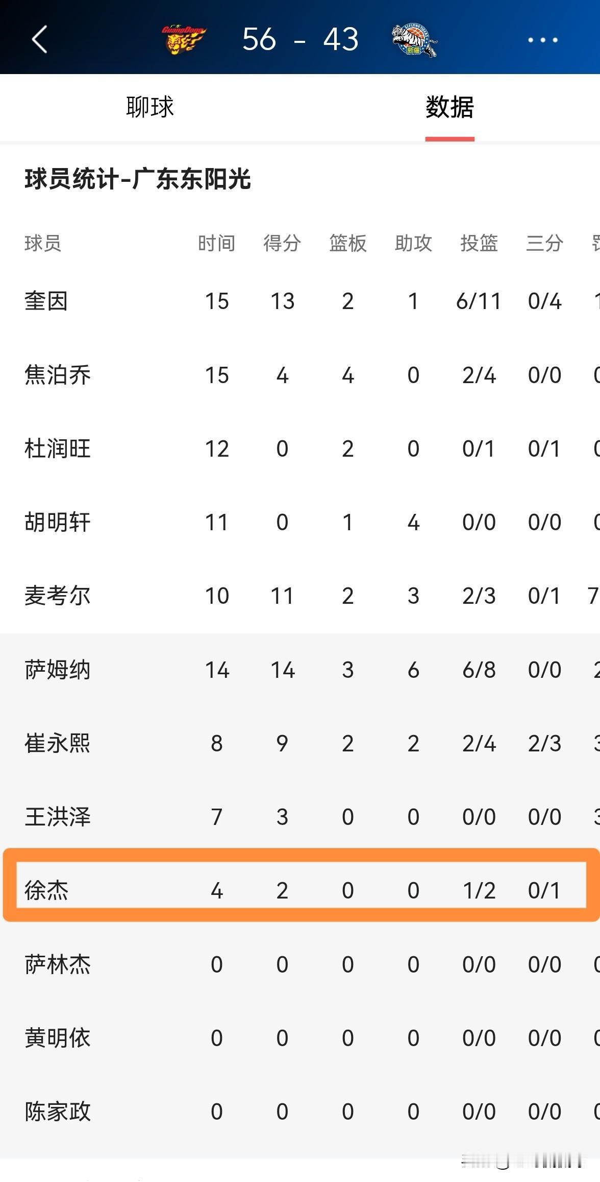 广东东阳光巨星徐杰真是太不被尊重了!在今天广东东阳光主场迎战新疆伊犁特的比赛中,目前双方半场战罢,广东东阳光以56:43领先对手13分。值得一提的是,在前两节比赛中,全明星票王徐杰仅仅得到了4分钟的上场时间,投篮2中1,其中三分球1中0得到2分,他的场上正负值为+9。 坦白说,广东东阳光主帅杜峰对待徐杰的方式真是缺乏尊重,杜峰教练不仅将徐杰降为替补,而且大幅度的缩短了徐杰的上场时间。好歹徐杰也是全明星票王,杜峰教练怎么能够用这样的方式对待徐杰呢?