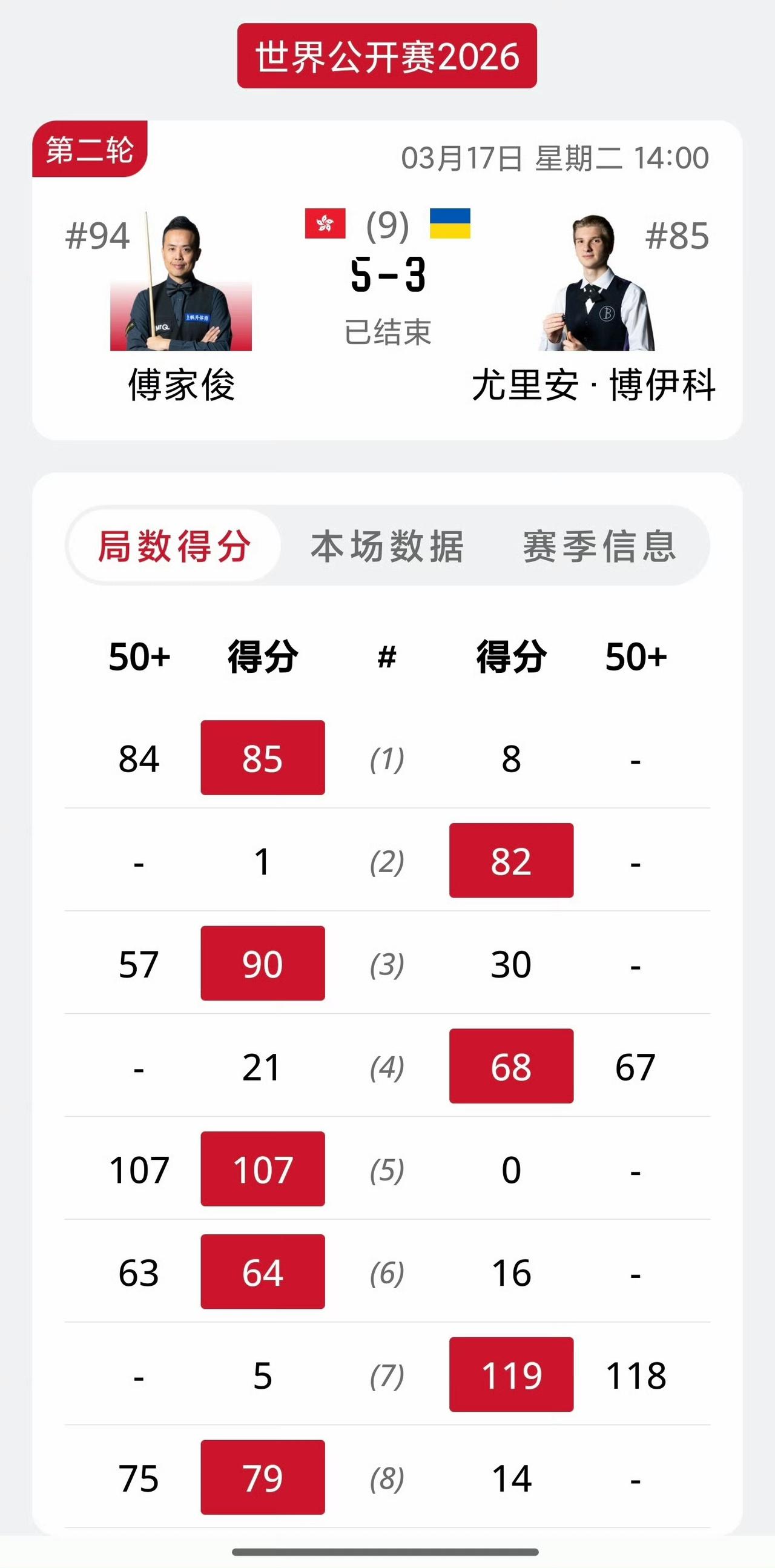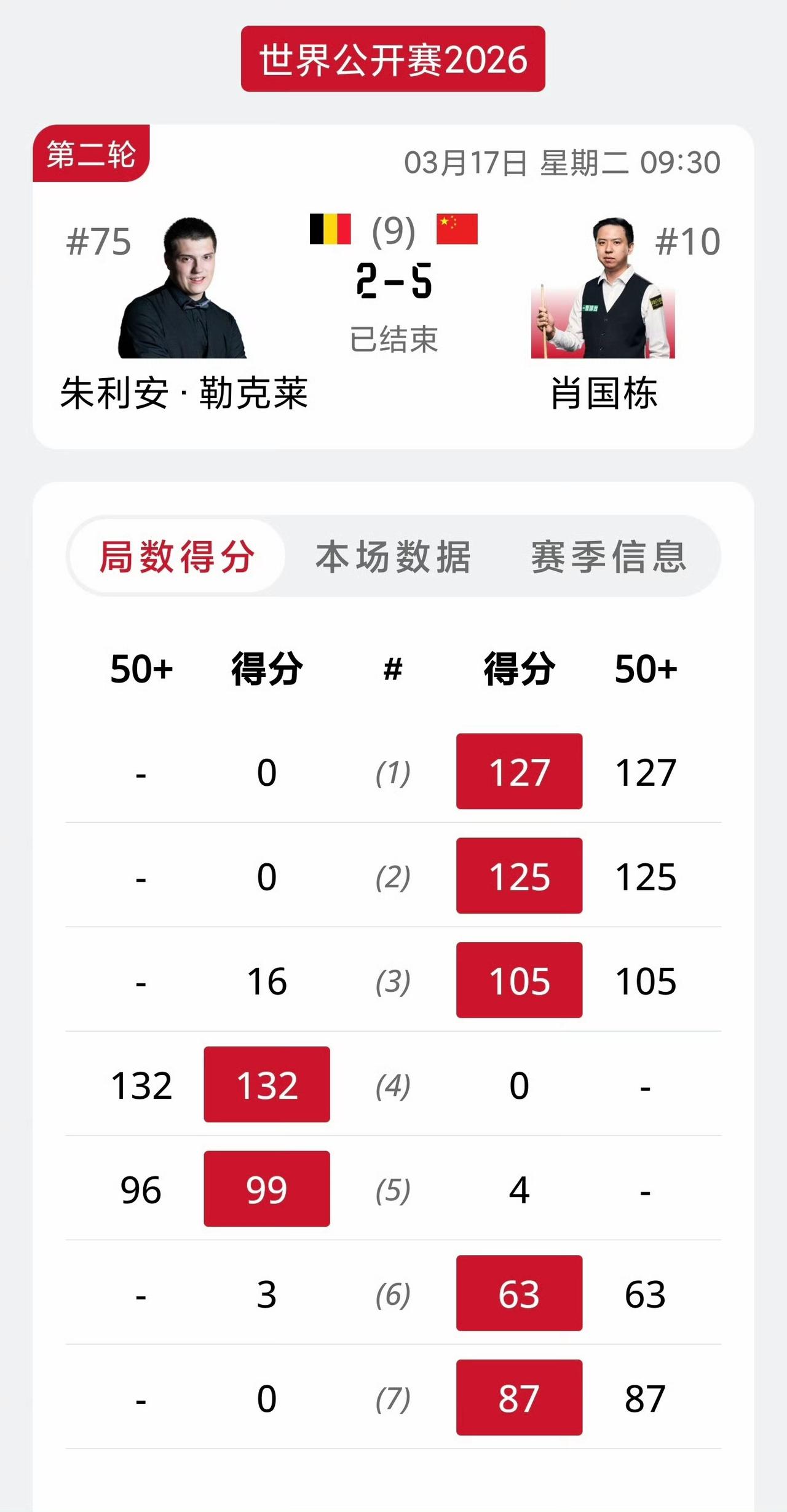 玉山公开赛,今晚的焦点战一定是赵心童和龙泽煌这场中国德比。前四局两人各胜2局,2-2战平进入中场休息。 今天早些时候已有肖国栋、吴宜泽、张安达、傅家俊四位中国球员晋级32强。 肖国栋5-2勒克莱尔 吴宜泽5-3常冰玉 张安达5-1霍尔沃斯 傅家俊5-3博伊科 比较遗憾的是希金斯、卡特被淘汰了。