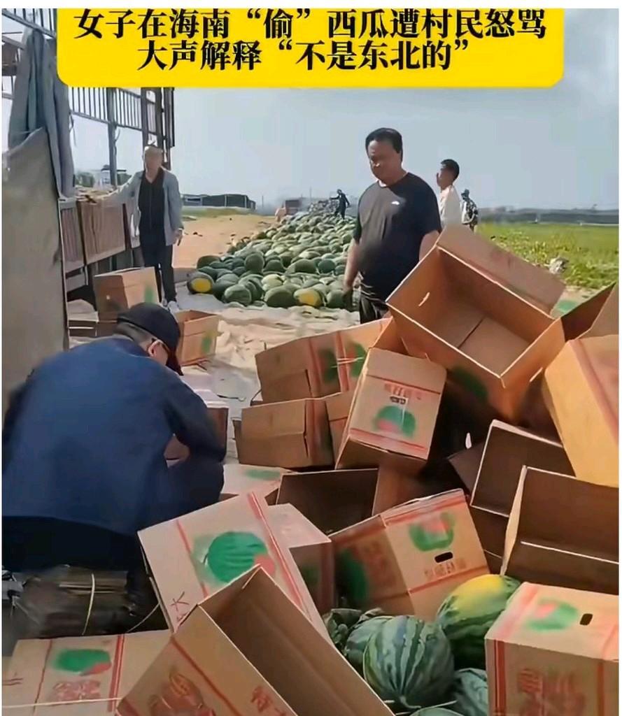 海南,两位大妈疑似到人家田里面“捡”西瓜,遭村民怒骂:“我们海南人没有偷瓜的”,大妈解释:“我们不是东北的”,可能是不满被村民训斥,白色衣服大妈还忿忿不平的表示:“有话你就好好说,这个地方瓜不让捡”…… 视频显示:当时有收购商正在收这个田的瓜。人家瓜农在这边忙的不可开交,这两位大妈却在那里给他们添乱,换谁谁不生气! 可能在这位大妈的认知中,她们是大白天到人家田里面“捡”西瓜,算不得偷!!!