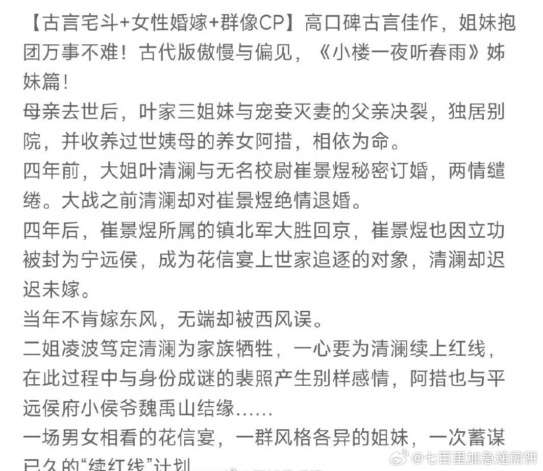 古装剧《当年不肯嫁东风》根据明月倾同名小说改编编剧:明月倾导演:待定该剧讲述叶家三姐妹于姻缘旋涡中共谱春日传奇的动人故事!