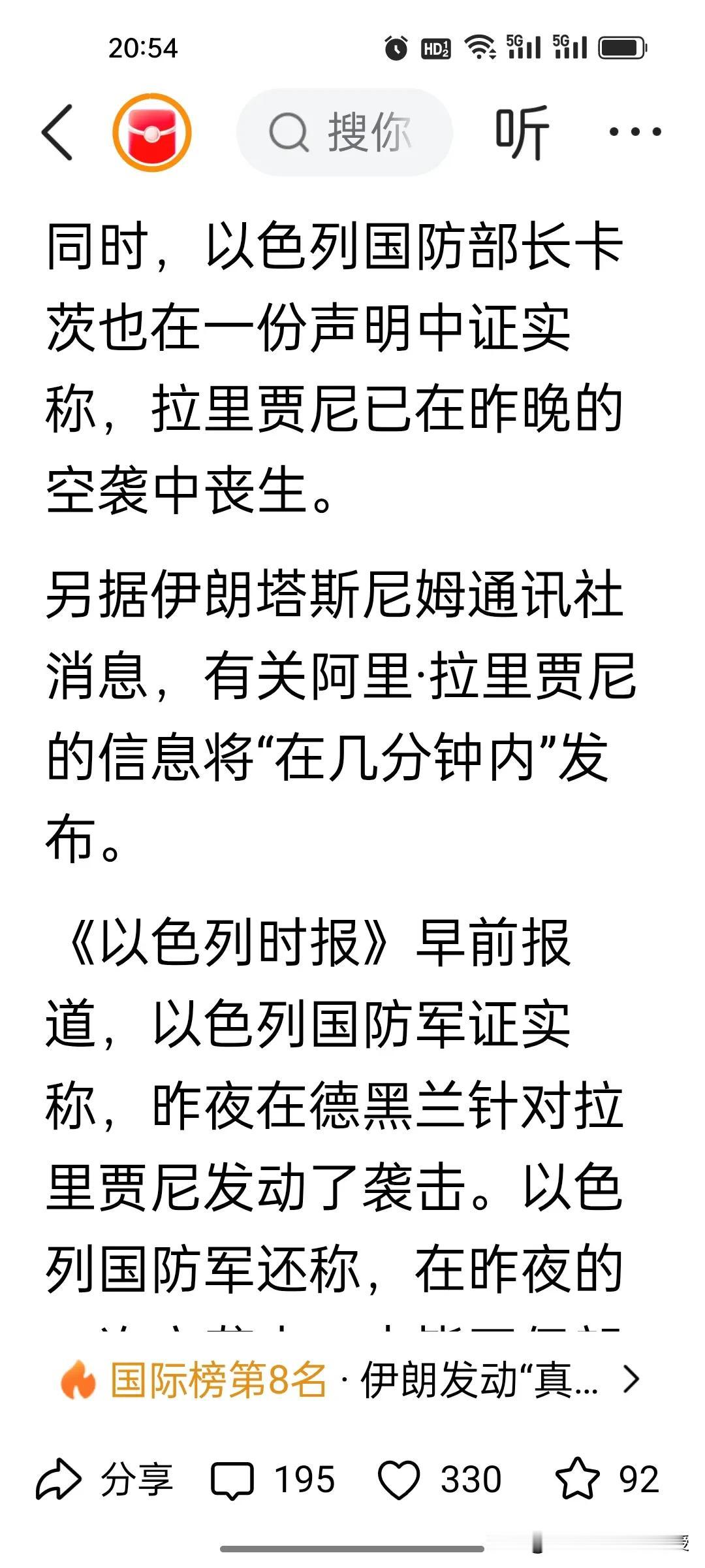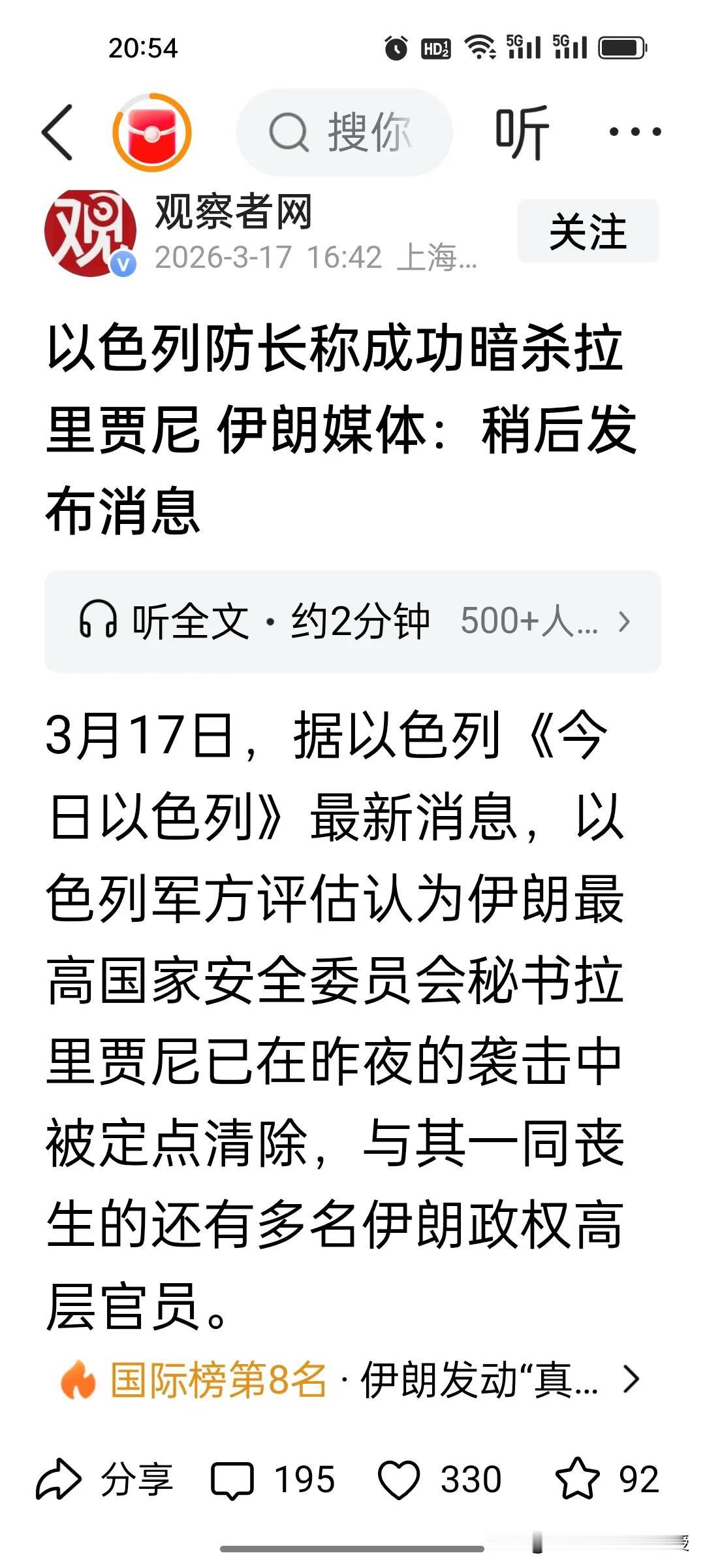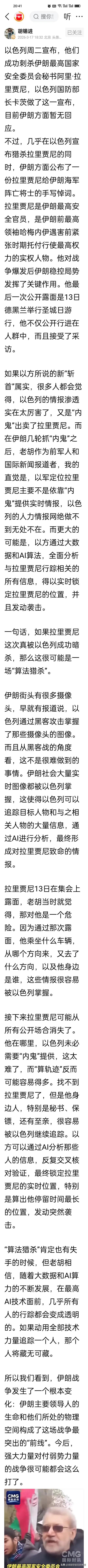 现在全网都在等伊朗第一手消息,拉里贾尼到底有没有被以色列暗杀?伊朗媒体说“几分钟后发布”。刚刚看到胡锡进推断,算法猎杀取代内鬼,才是中东暗战的真相? 以色列宣称暗杀拉里贾尼,外界第一反应都是“伊朗内鬼作祟”。但老胡的判断戳破了表象:人力渗透早已不是核心,大数据+AI才是精准斩首的关键。 伊朗街头的摄像头、人员的活动轨迹,全被算法拆解分析。拉里贾尼13号在公开场合出现过,也许他之后的行踪轨迹早就被定位,哪怕拉里贾尼深居简出,身边人的行踪也能被交叉锁定,人力情报根本跟不上技术的速度。 老胡认为,当算法能精准捕捉每一个行踪细节,所谓的“内鬼”反而成了次要因素。这场暗杀,是技术对人类安全防线的降维打击,更是未来战争形态的残酷预演。老胡的分析有一定的道理,至于伊朗如何破局,或许唯有切断数据流转的源头,才能在这场AI暗战中守住一线生机。